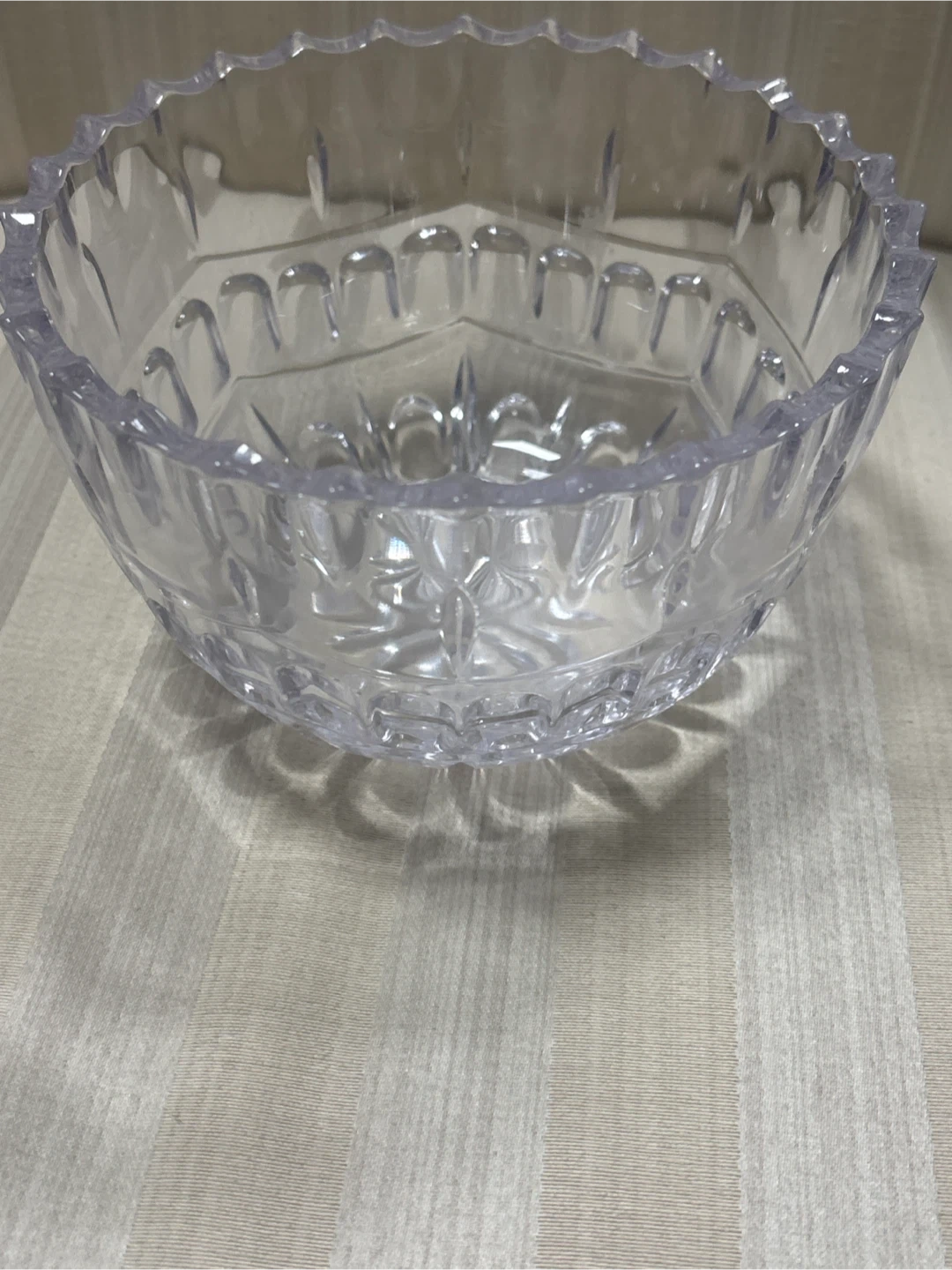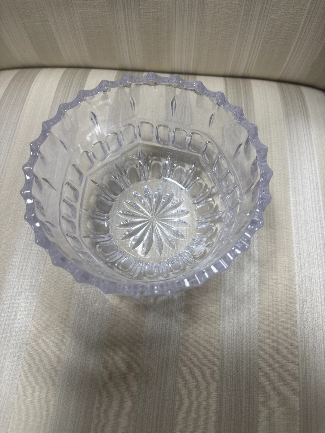 This is a clear glass decorative bowl. It features a cut glass design with a fluted rim. This bowl would be lovely for holding small items or as a decorative accent piece.