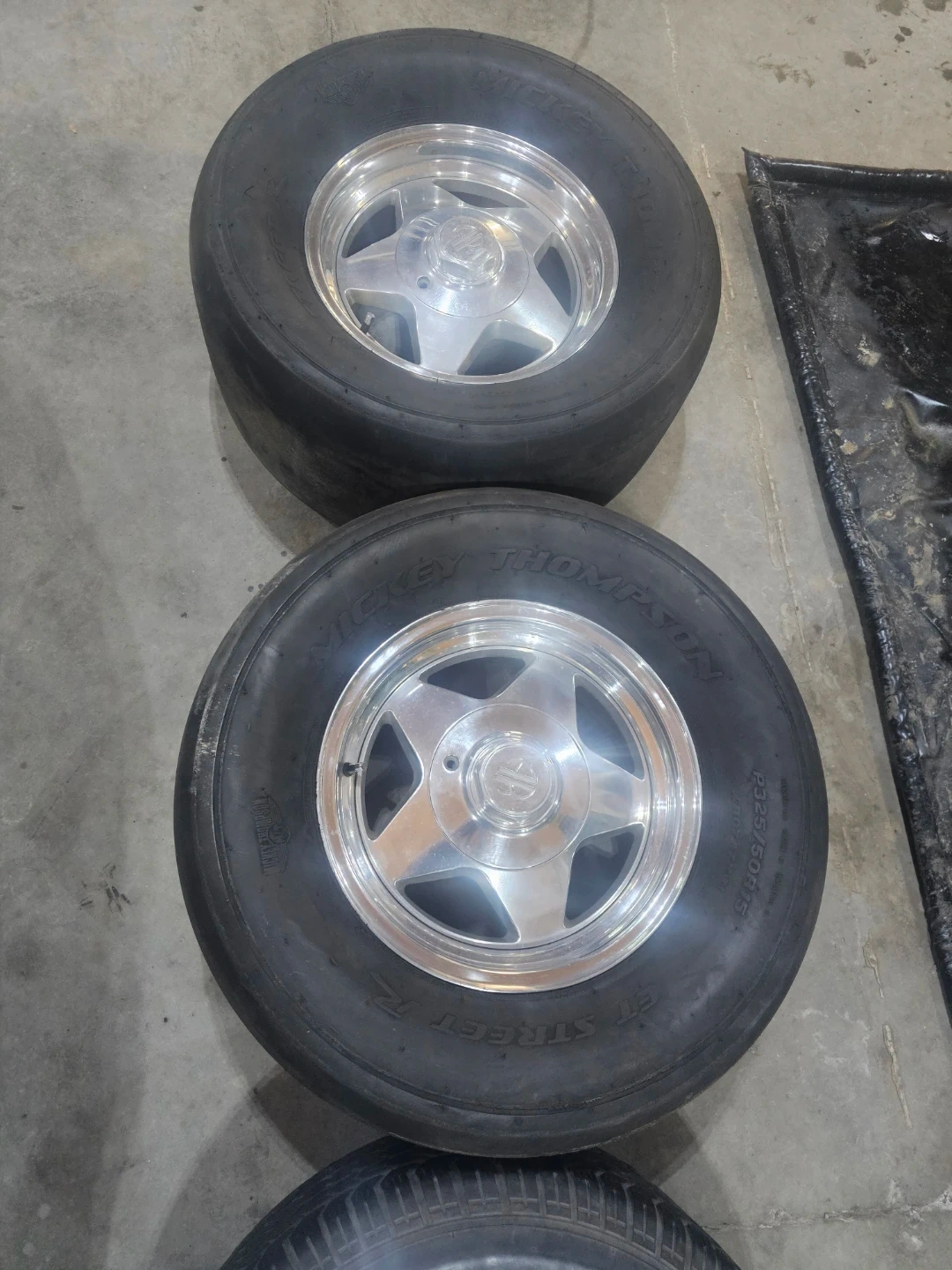 15x8 American racing 4x108/4x114 set of 5 star wheels. Comes with center caps, only missing bolts for them, shouldn't be hard to find replacements. 325 mickeys on the rear, should be replaced, 255s for the fronts, older tires, could maybe be used for a season. Couple rims have a few little nicks. But are in fantastic shape for their age. No cracks or bends.