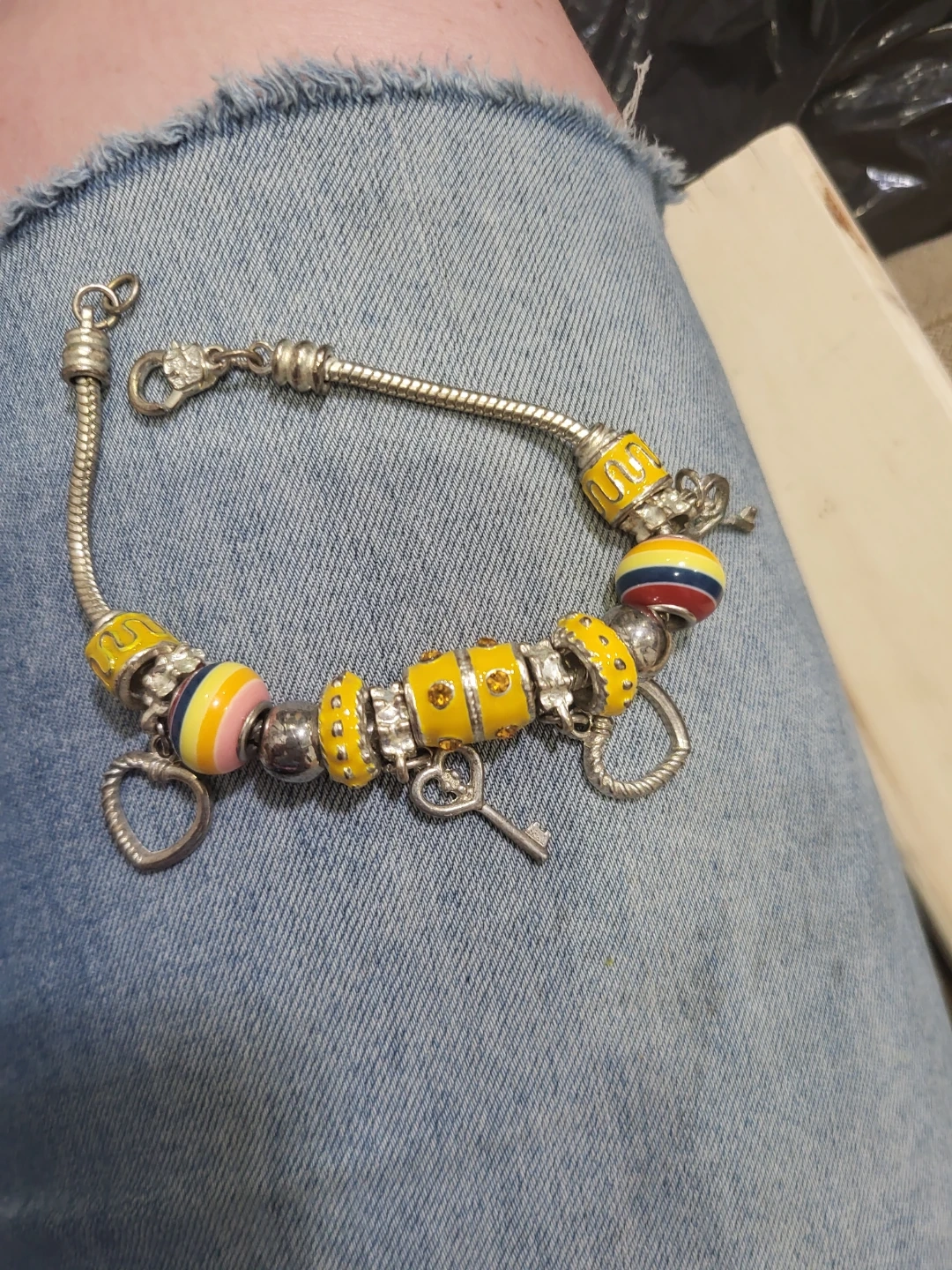 This charm bracelet features multiple yellow beads with silver detailing and small rhinestones. It includes decorative charms like a key and a heart. The clasp is a standard lobster claw type. Pick up only