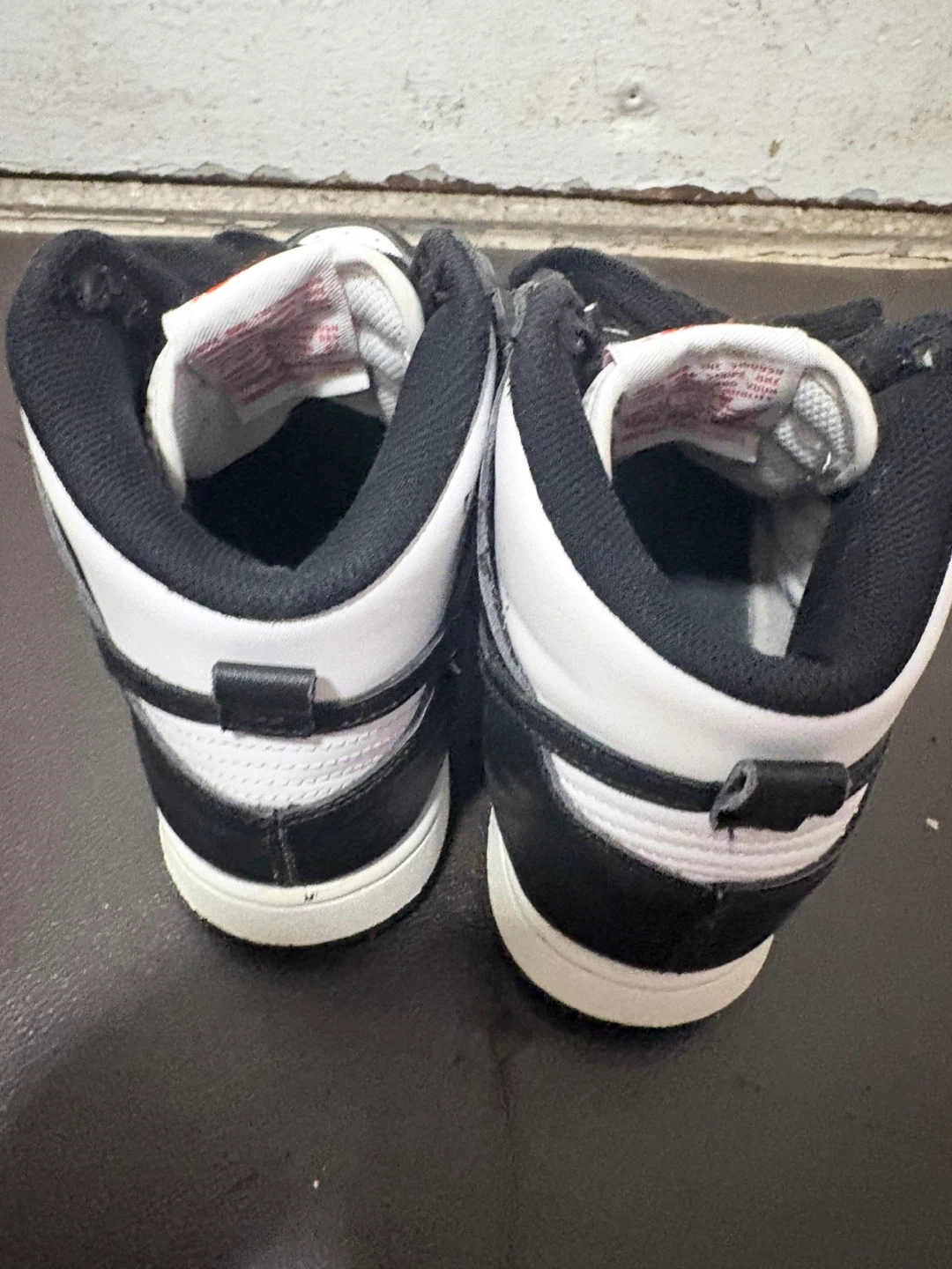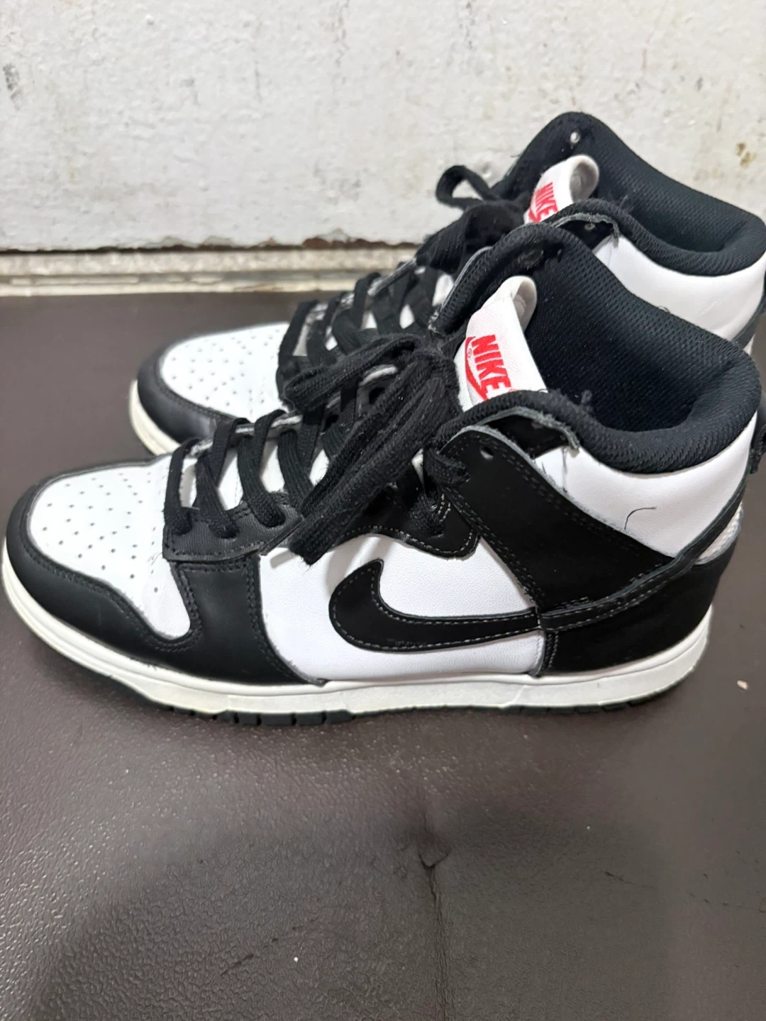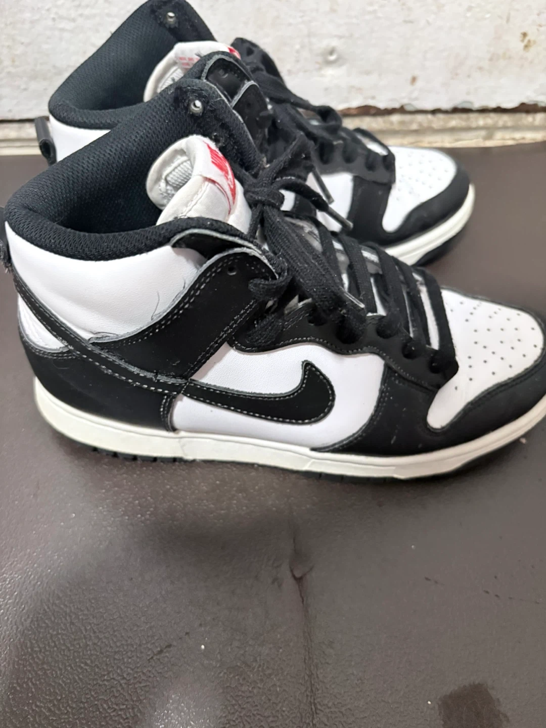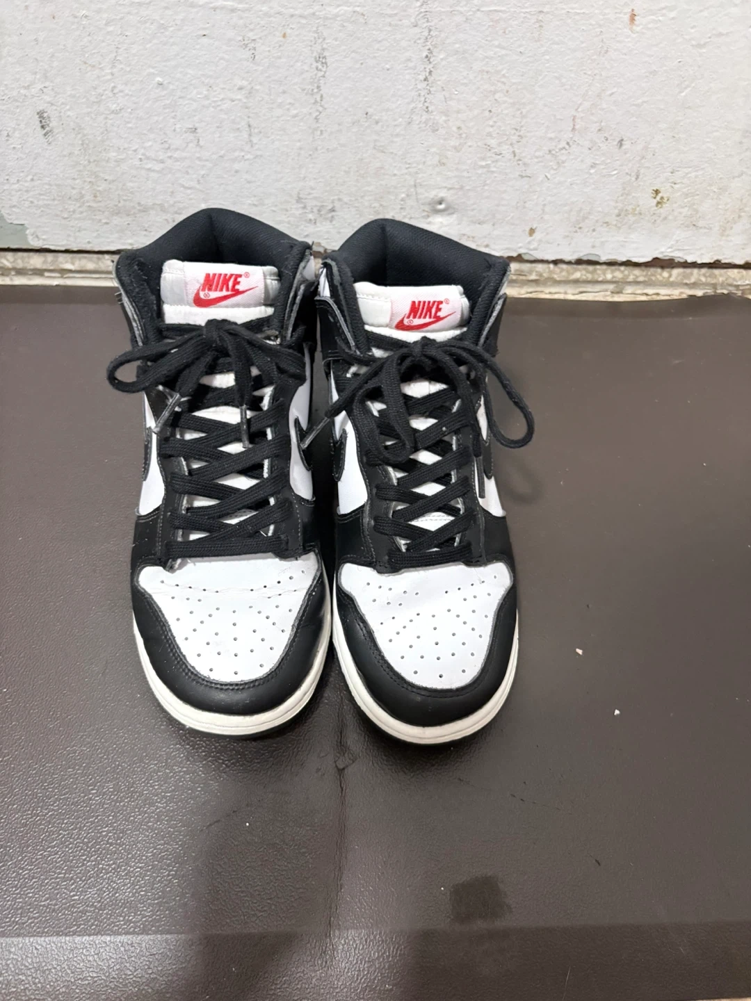 Nike Dunk High Top sneakers in a classic black and white colorway. These shoes feature a durable construction and a timeless design. Leather and synthetic upper for a premium feel. Rubber outsole for traction. Some wear and tear on the bottom small accents.