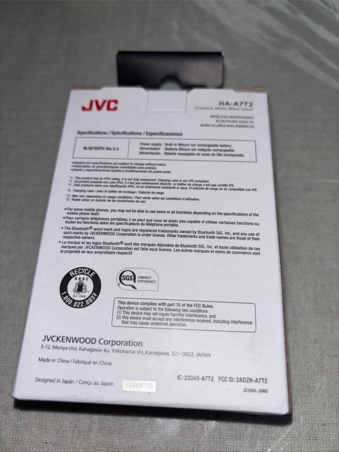 These JVC Gummy HA-A7T2 true wireless earbuds come in Coconut White. They offer Bluetooth 5.3 connectivity and a built-in rechargeable battery. Enjoy wireless listening on the go!
