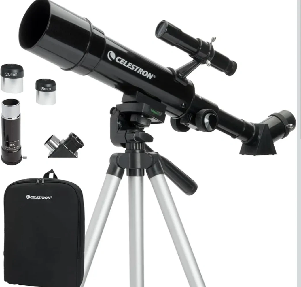 This is a Celestron telescope, complete with a carrying bag and multiple eyepieces (20mm and 8mm) plus a 3x Barlow lens. It's a great starter telescope for viewing the night sky. Comes with a tripod for stable viewing.