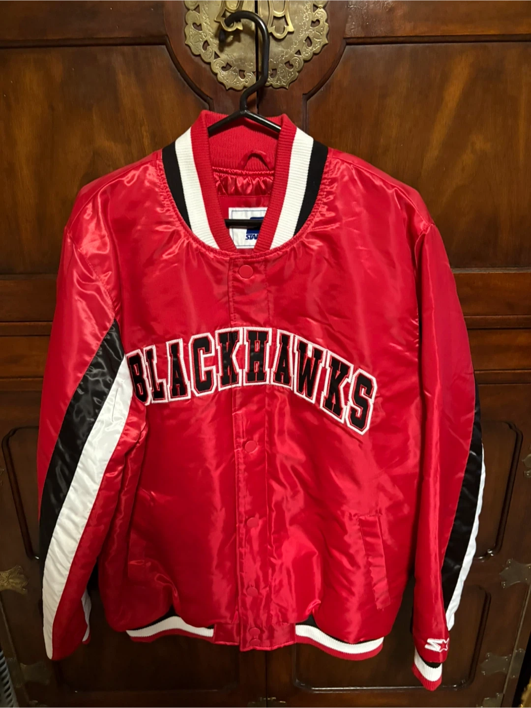 Selling a Starter Blackhawks satin jacket in size Large. It's in great condition with the classic Starter logo on the sleeve. Perfect for any Blackhawks fan! Brand new, never worn. No scratch’s on any of the buttons.