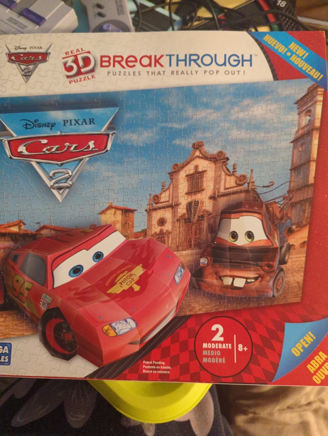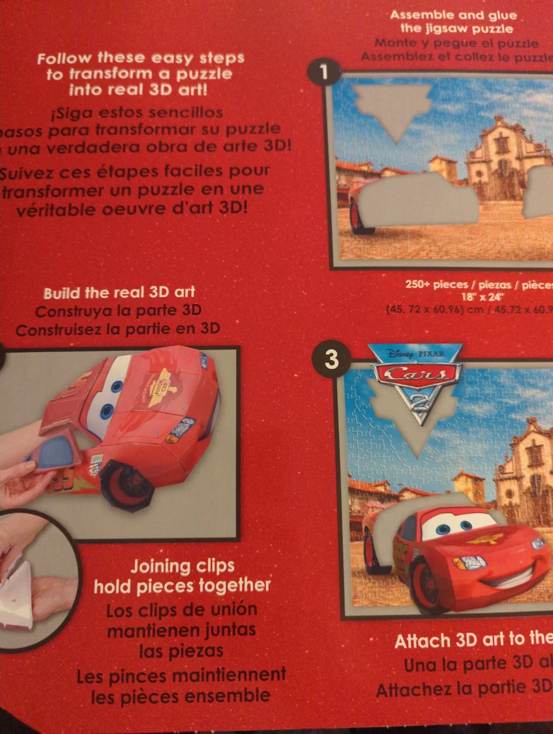 Disney Pixar Cars 2 3D Breakthrough Puzzle with over 250 pieces. It's a moderate to difficult puzzle, recommended for ages 8 and up. The finished puzzle is approximately 18" x 24". Follow simple steps to transform your puzzle into real 3D art!