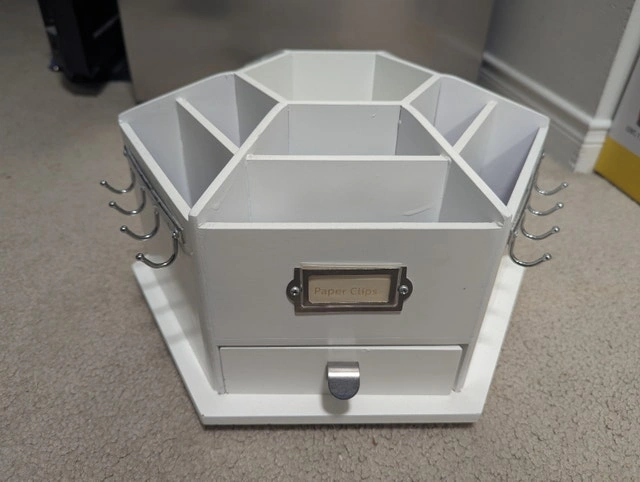A rotating hobby and craft tool organizer. It's surprisingly large at more than a foot across (14" x 12.25" x 7.5" / 35cm x 31cm x 19cm). It's in good shape, spins well, and all the parts are here, but the elastic is worn out.