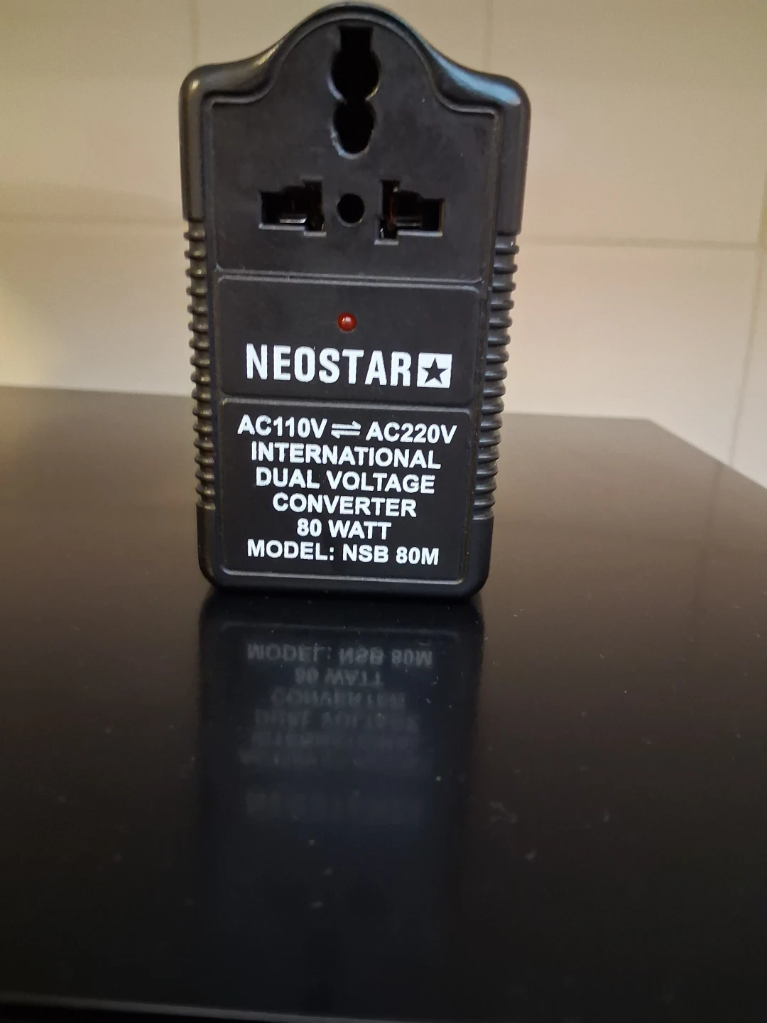 This is a Neostar international dual voltage converter. It supports AC110V to AC220V. The model is NSB 80M and it's rated for 80 watts. It's useful for travellers needing to adapt electronics between different voltage systems.