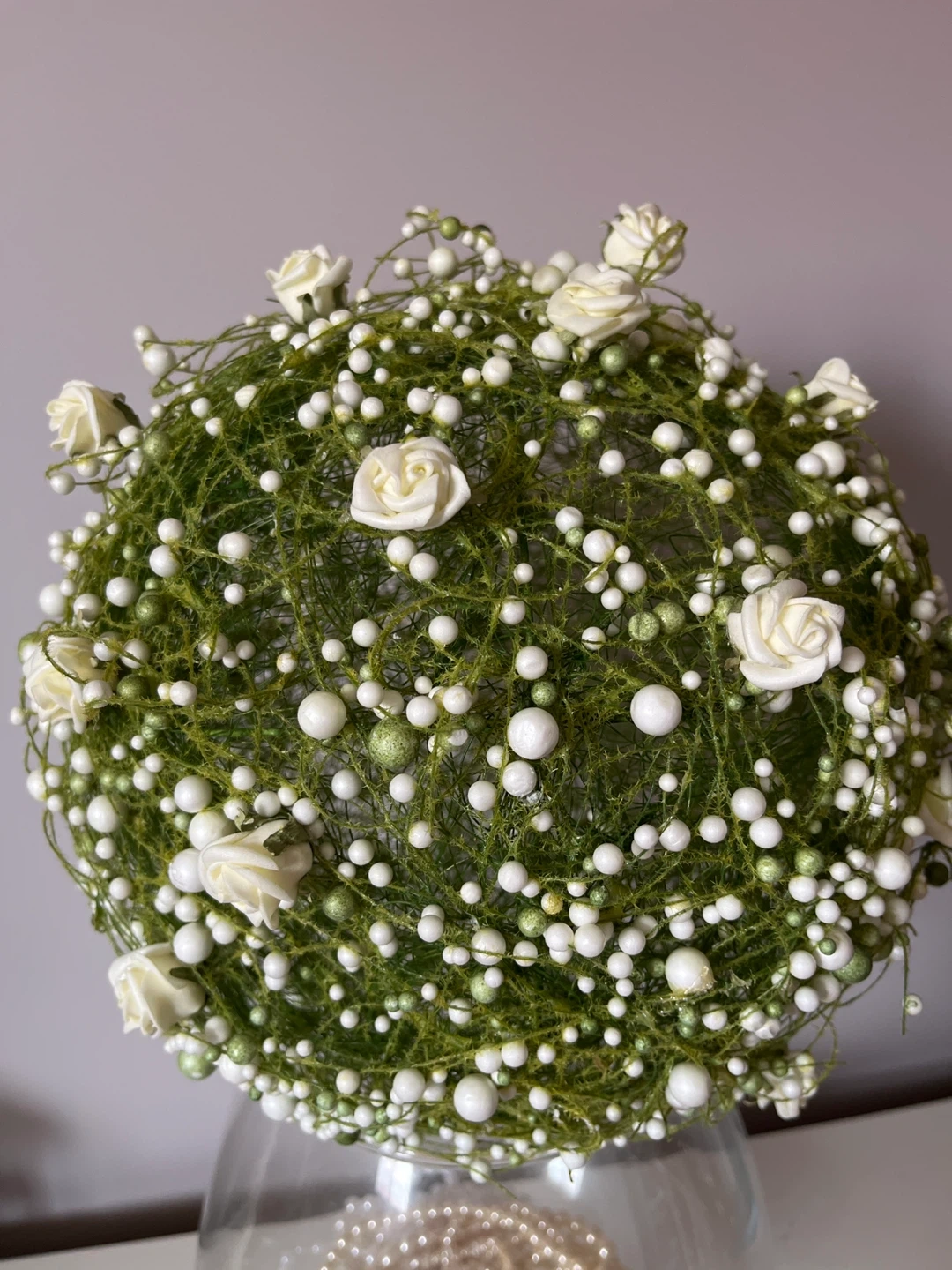 A decorative topiary green sphere with delicate white roses and an assortment of white and green beads. It's covered in a moss-like material and thin green strands. This piece would make a lovely accent for home decor. CASH only please