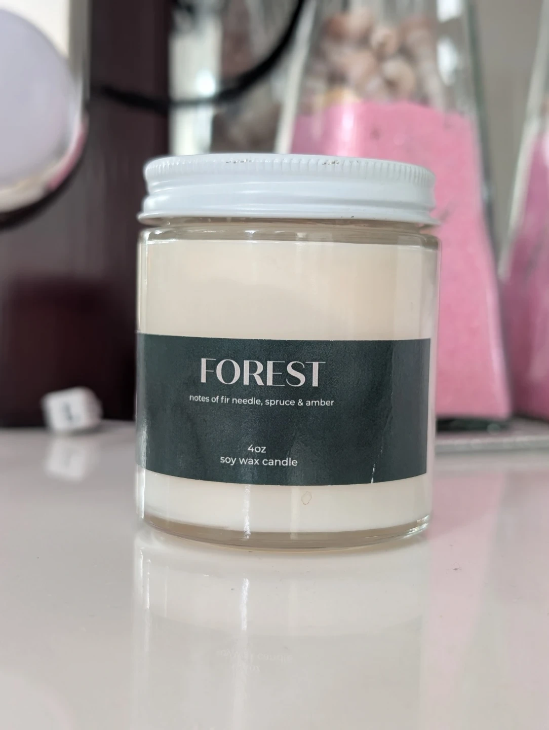 This is a 4oz soy wax candle with a Forest scent. It features notes of fir needle, spruce, and amber. It's housed in a clear glass jar with a white lid.