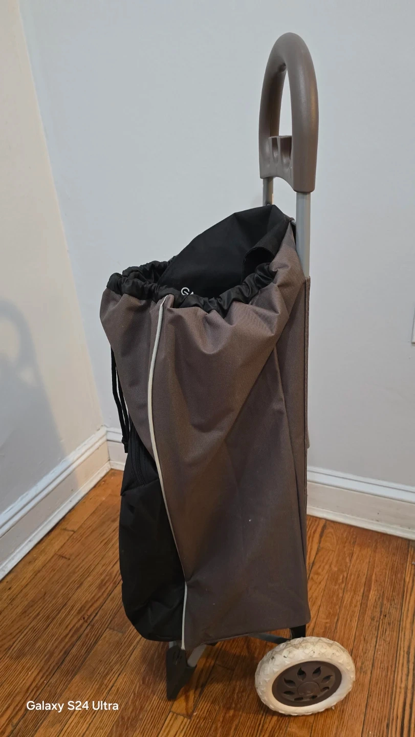 This rolling shopping cart from GNA USA features a durable fabric bag with a drawstring closure and an insulated front pocket. It has a sturdy metal frame and easy-roll wheels for convenient transport. This cart is great for groceries or laundry!