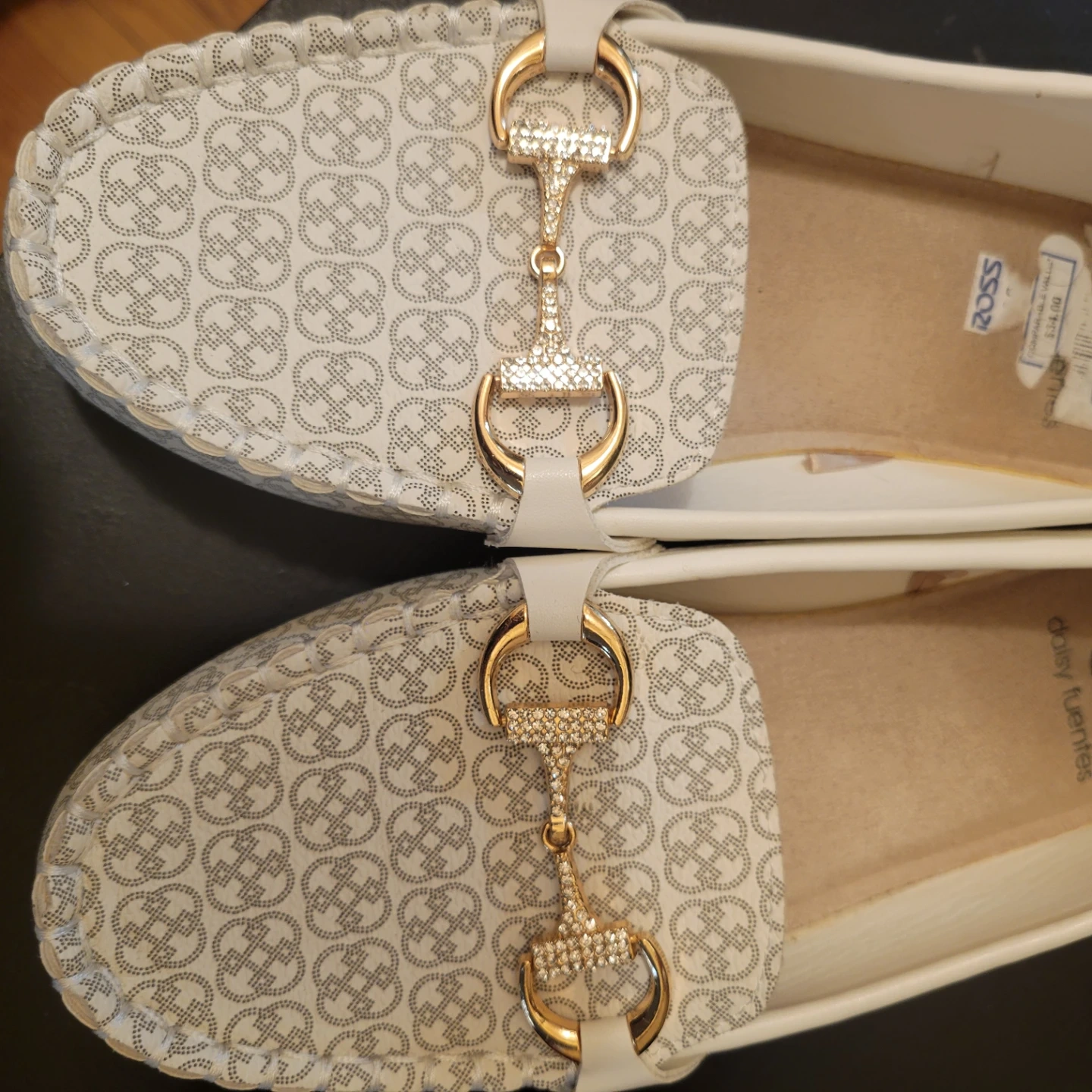 These Daisy Fuentes loafers feature a white and grey monogram pattern with gold and crystal embellishments. They're comfortable slip-on shoes with a classic moccasin toe. These shoes are a 7.5