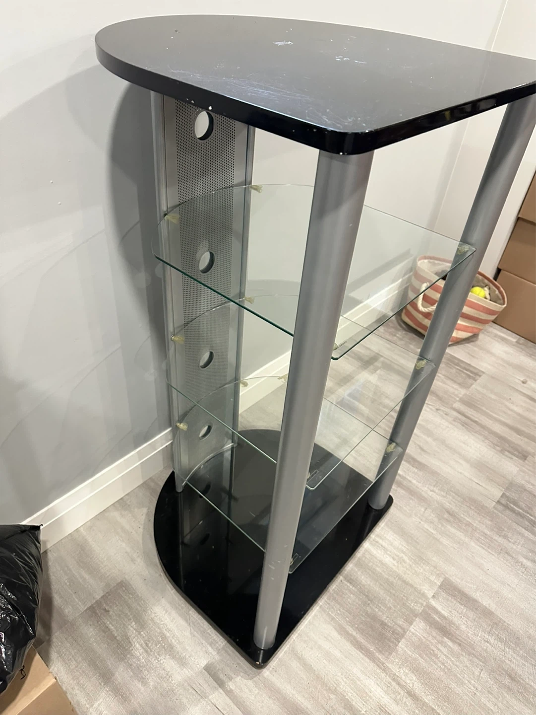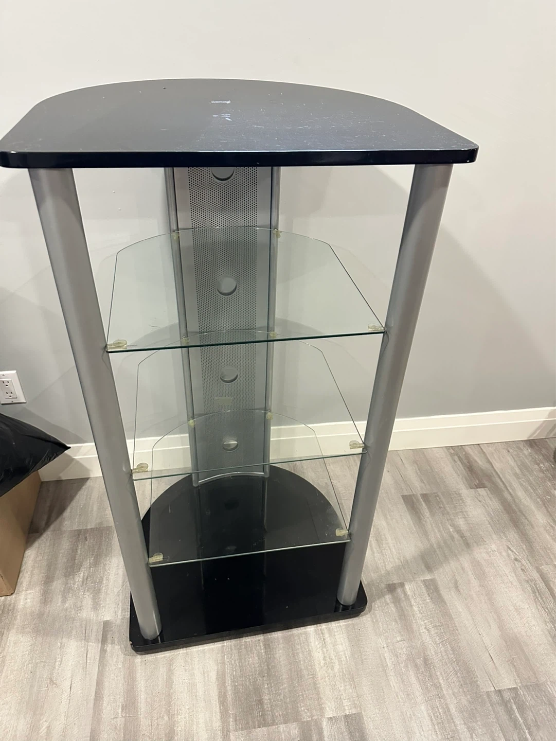 This media stand features a black top and base with silver-coloured supports. It has three clear glass shelves for storing electronics or decor. The stand offers a sleek design for organizing your entertainment setup.
