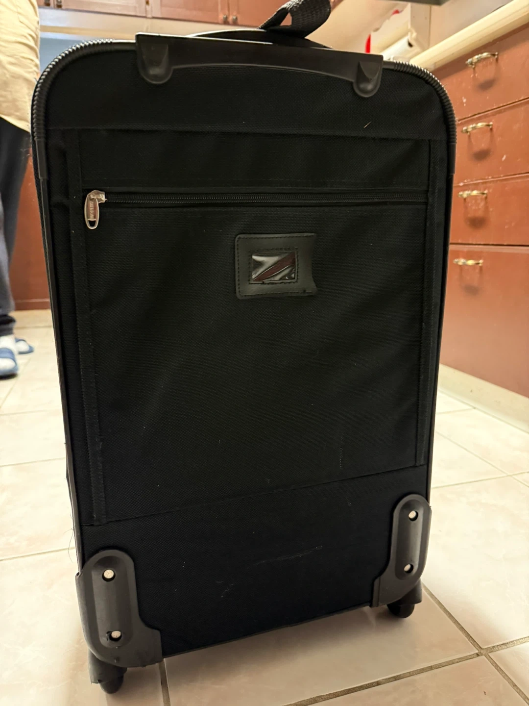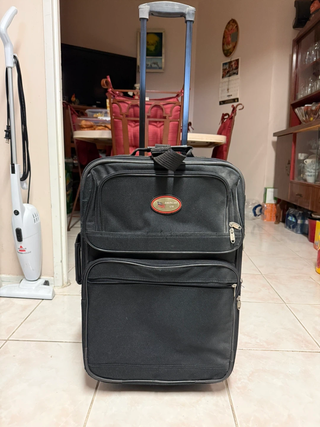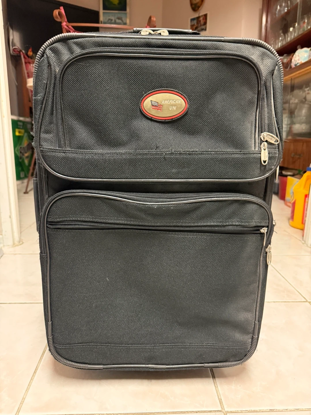 This is a black American Uni rolling suitcase. It's made of durable fabric and has multiple zippered compartments. The telescoping handle and wheels make it easy to transport.
