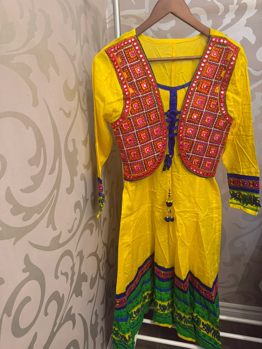 Bright yellow kurti featuring a colourful embroidered vest adorned with mirror work. The vest has a blue tie-up closure. It's embellished with vibrant patterns and tassels. Perfect for festive occasions!