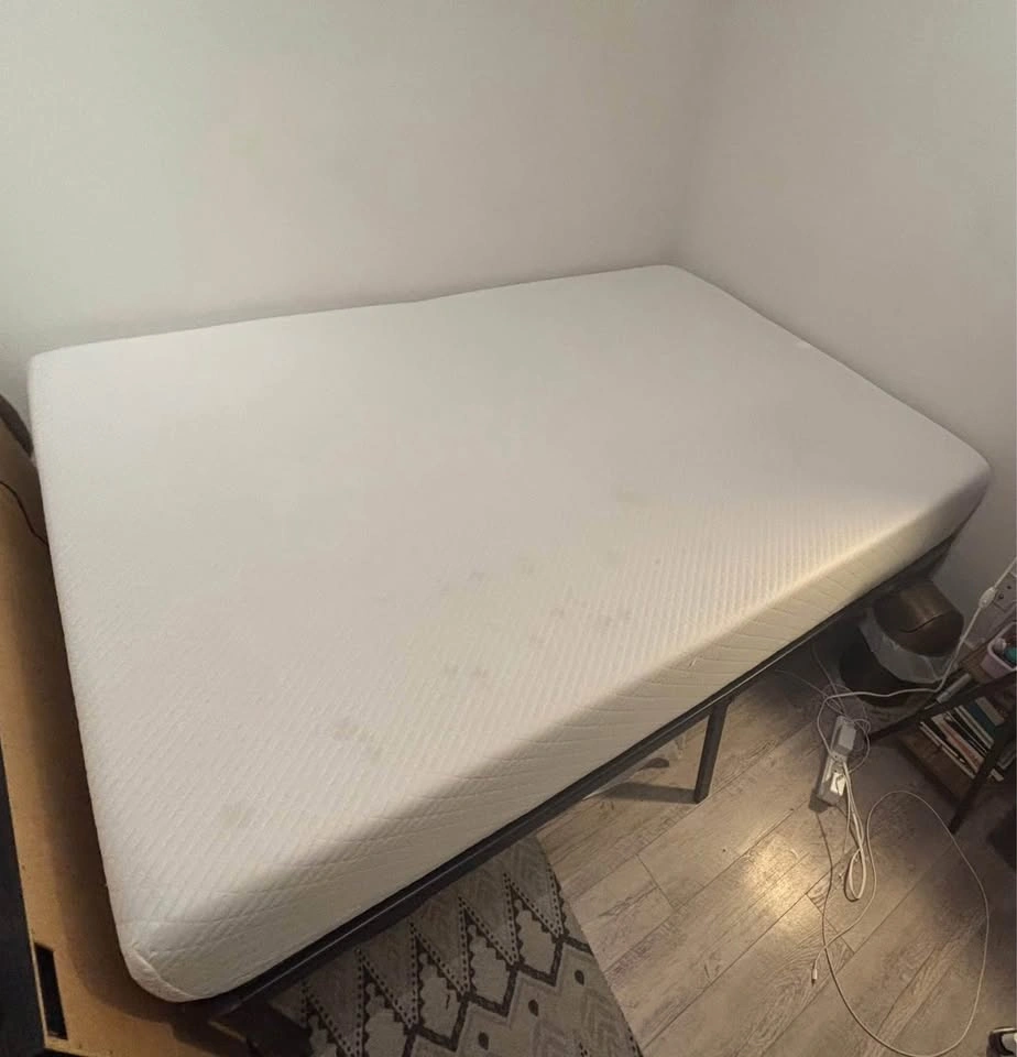 97Selling a 10” ZINUS Green Tea Essential Memory Foam Mattress. - It is CertiPUR-US certified and designed for excellent pressure relief and comfort. - Item weight: 44.83 Pounds - Super comfortable and perfect for a good night’s sleep. - No odours, gently used in a pet free, smoke free home. - There are a few light coffee stains (visible on one side in the photos) purely cosmetic but they are old and don’t affect use or hygiene. - Must pickup between 10-12 November only! - Also checkout my other listings please, thanks! - Pickup only!