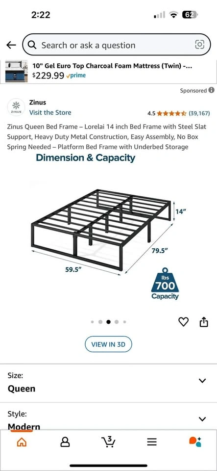 New in box Zinus Trisha 7 inch metal bed frame (QUEEN)