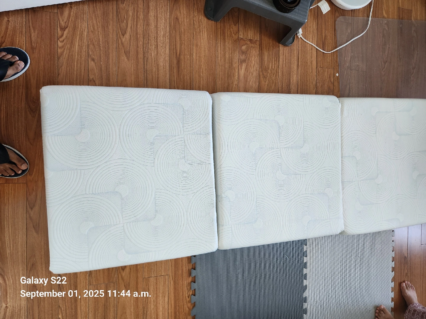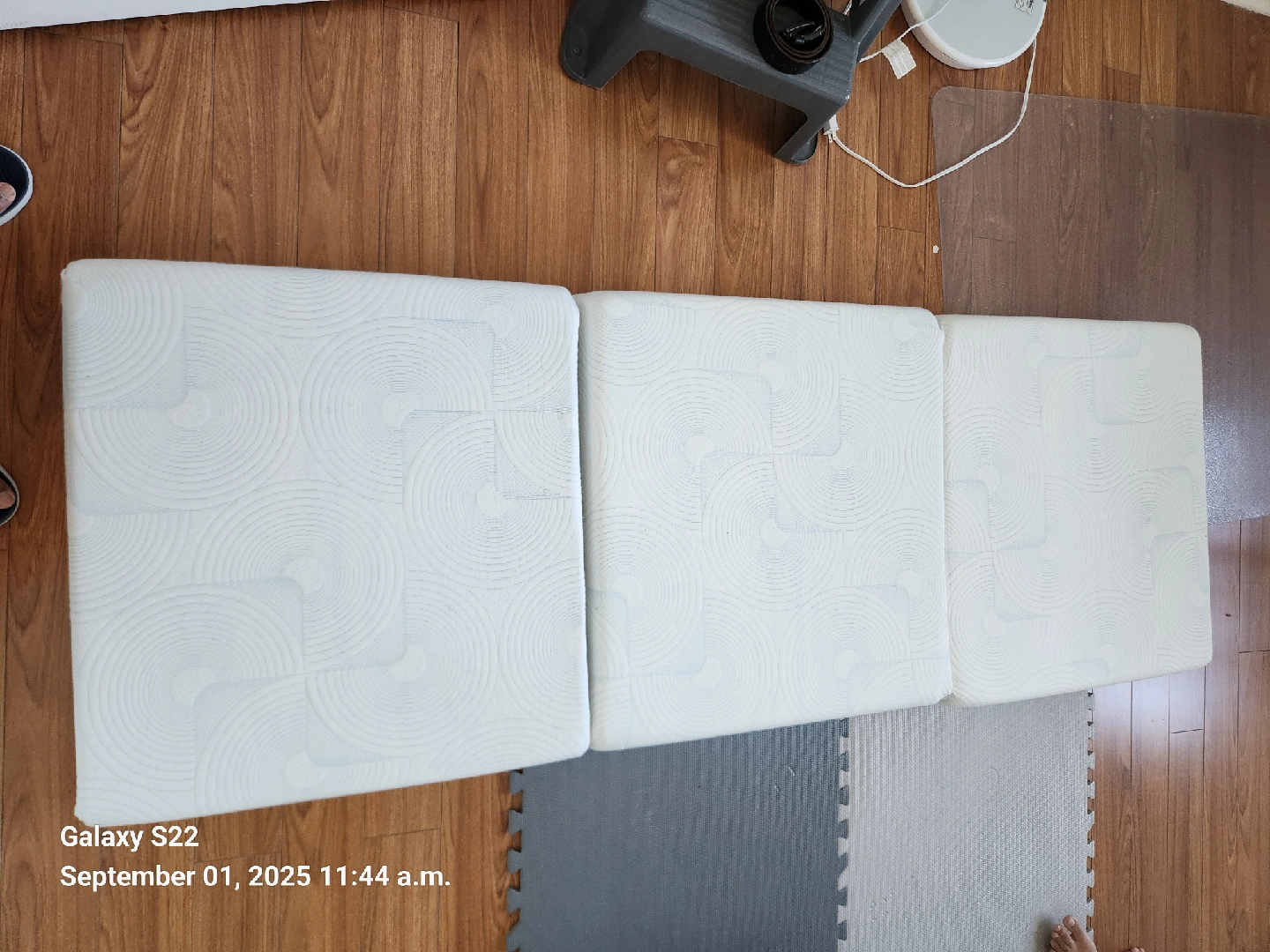Selling a gently used Zinus Gel Memory Foam 5 Inch Tri-Fold Comfort Portable Folding Floor Mat, Single. Pet free, smoke free home Removable, Washable cover It's perfect for kids rooms, guests or small spaces! It's lightweight and portable, making it easy to store when not in use. The dimensions are 75" x 27" x 5". Pickup only, cash only, no negotiation
