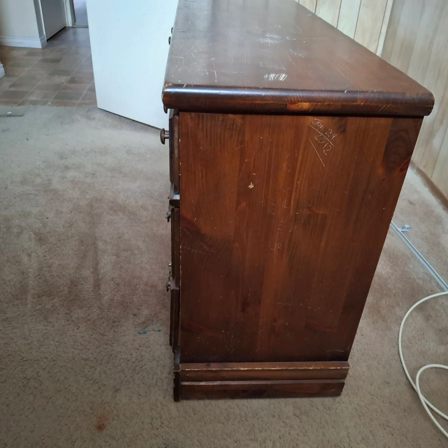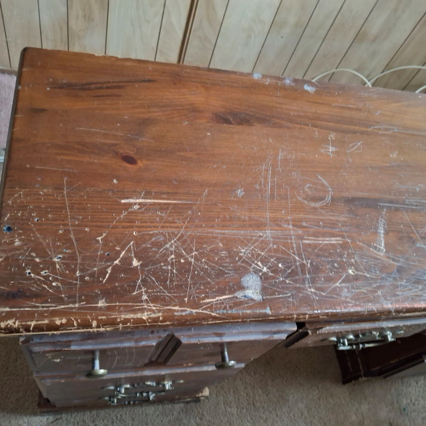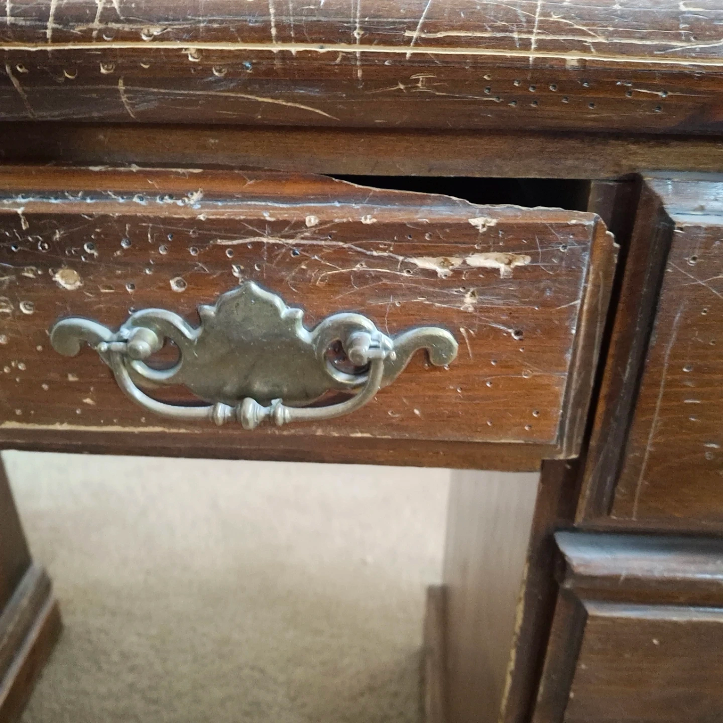 This is a dark wood desk with a total of nine drawers. It has a classic design with brass-toned drawer pulls. The desk shows signs of wear, including scratches on the top and some minor damage to one of the drawer fronts-- see photos Has some carvings but overall solid