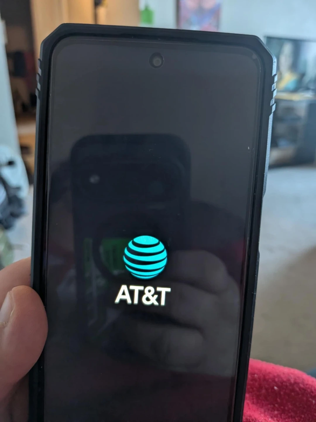 This is an AT&T branded smartphone, ready for setup. It comes with a rugged protective case featuring a kickstand. The phone appears to be a standard model, suitable for general use.