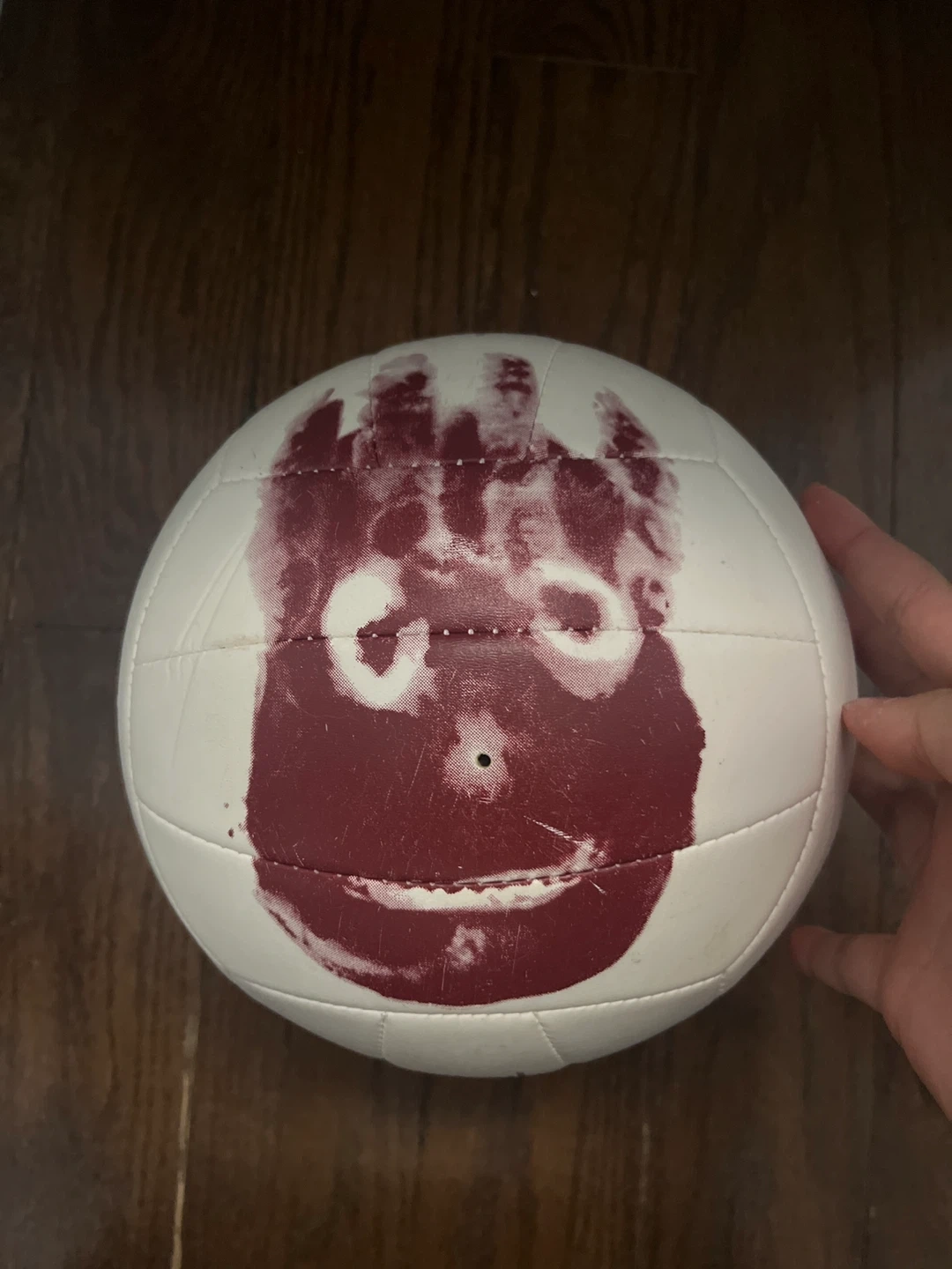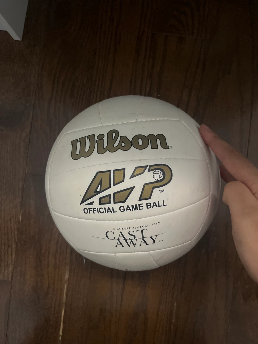 This is a Wilson AVP Official Game Volleyball from the Cast Away movie edition. It's white with a maroon handprint design on one side. Perfect for a collector or a game of volleyball!