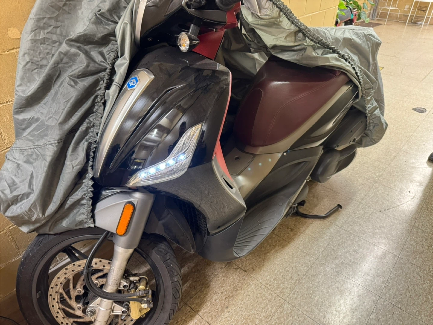 This is a Piaggio Beverly 350 scooter. It has a deep red and silver color scheme. The seat is a dark red leather.