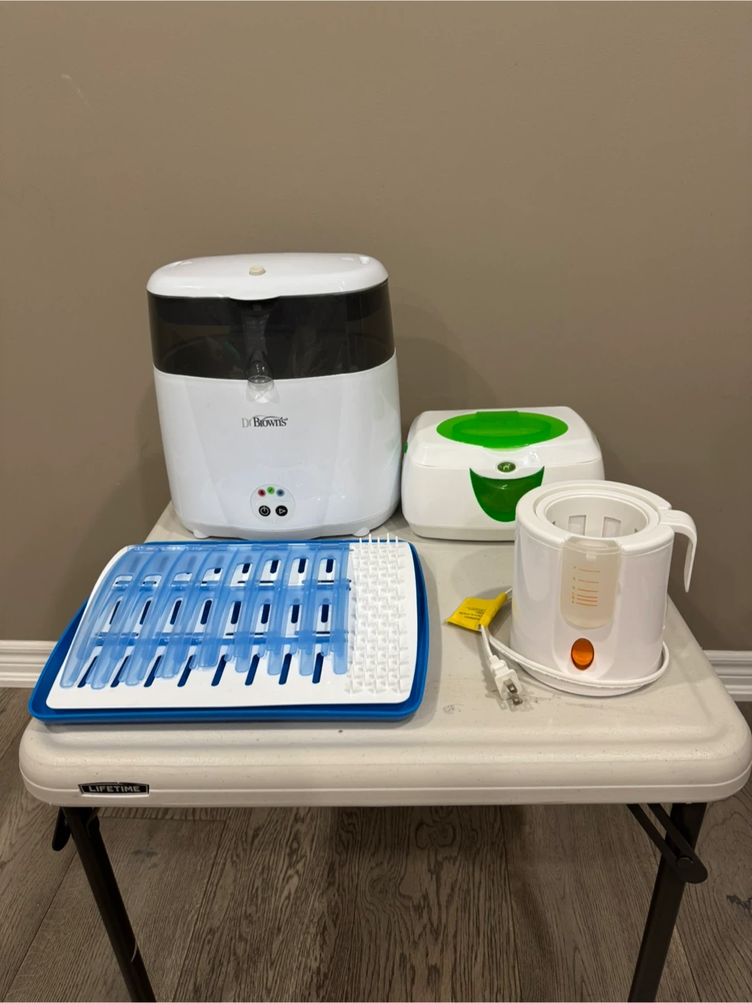 Up for sale a Dr Browns bottle sterilizer and drying rack. Munchkin bottle warmer and baby wipes warmer. All in working condition. Asking $50 for all 4 pieces.