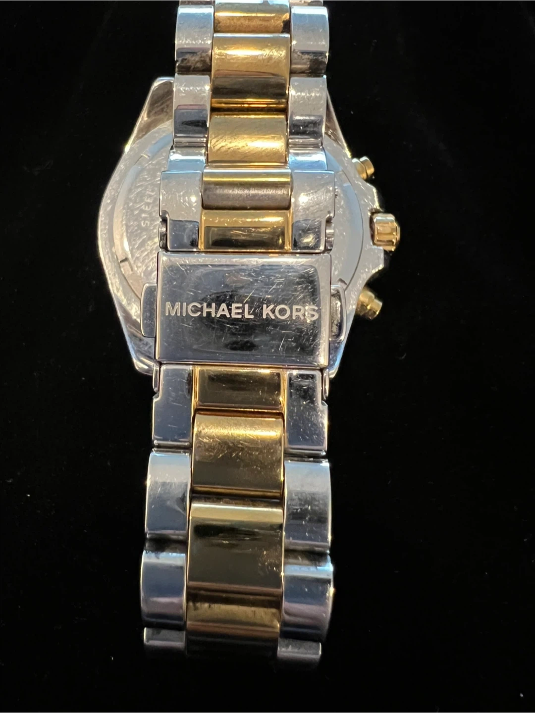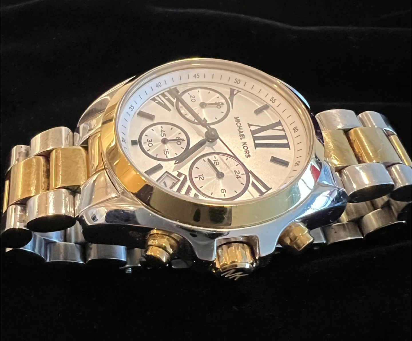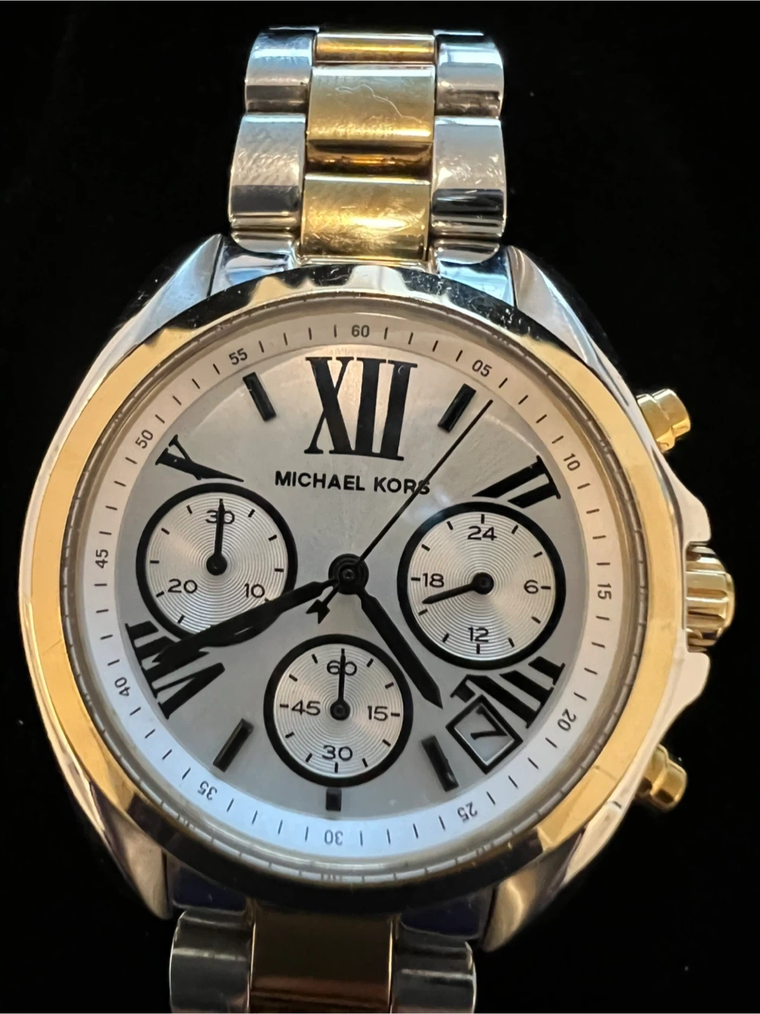 This is a Michael Kors chronograph watch with a two-tone stainless steel band. It features a silver dial with Roman numerals and three subdials. Water resistant up to 10 ATM. It's a stylish accessory for everyday wear.