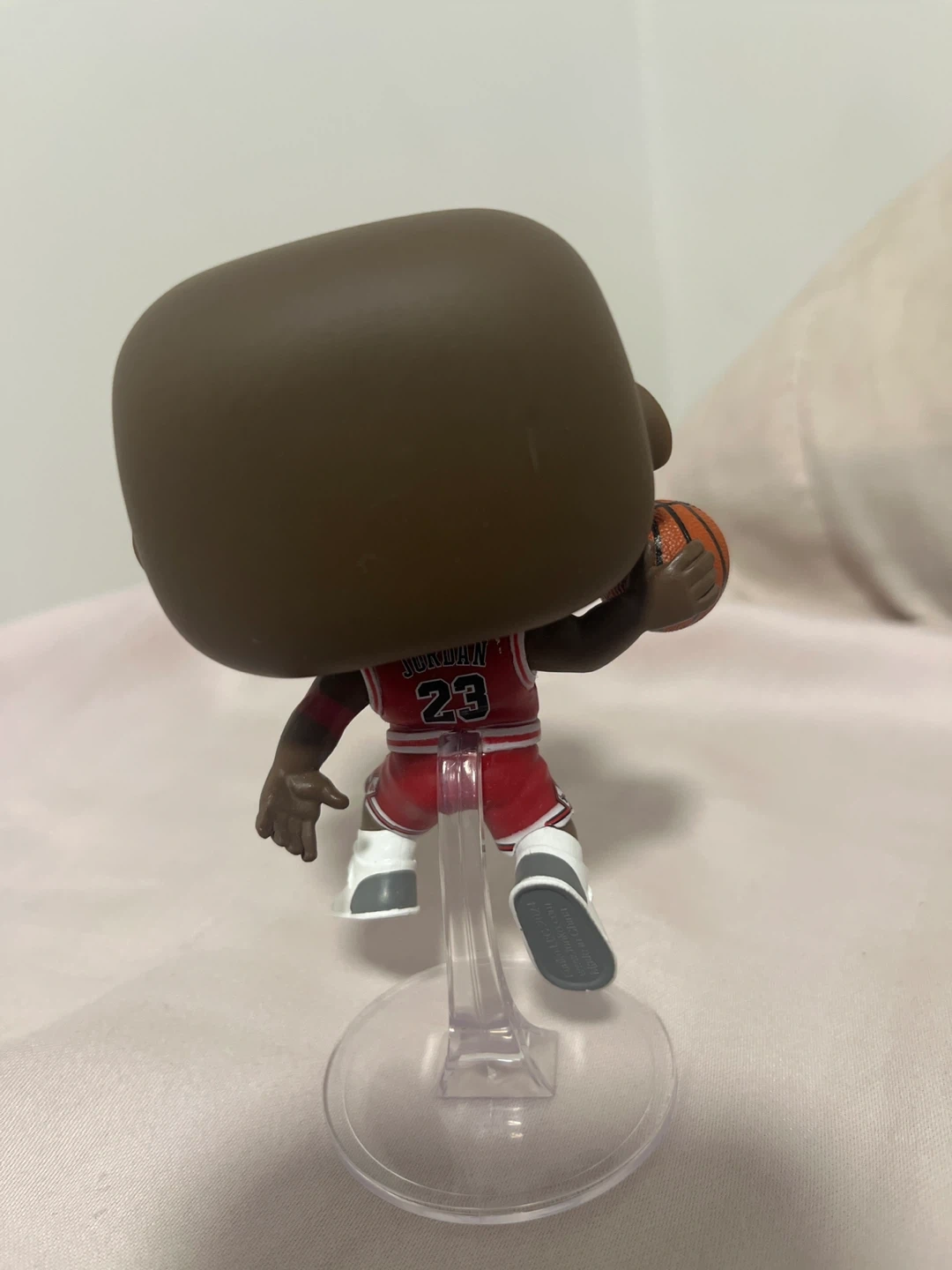 This is a Funko Pop! figure of Michael Jordan in his Chicago Bulls jersey, holding a basketball. It's mounted on a clear display stand. It's a great collectible for basketball fans!