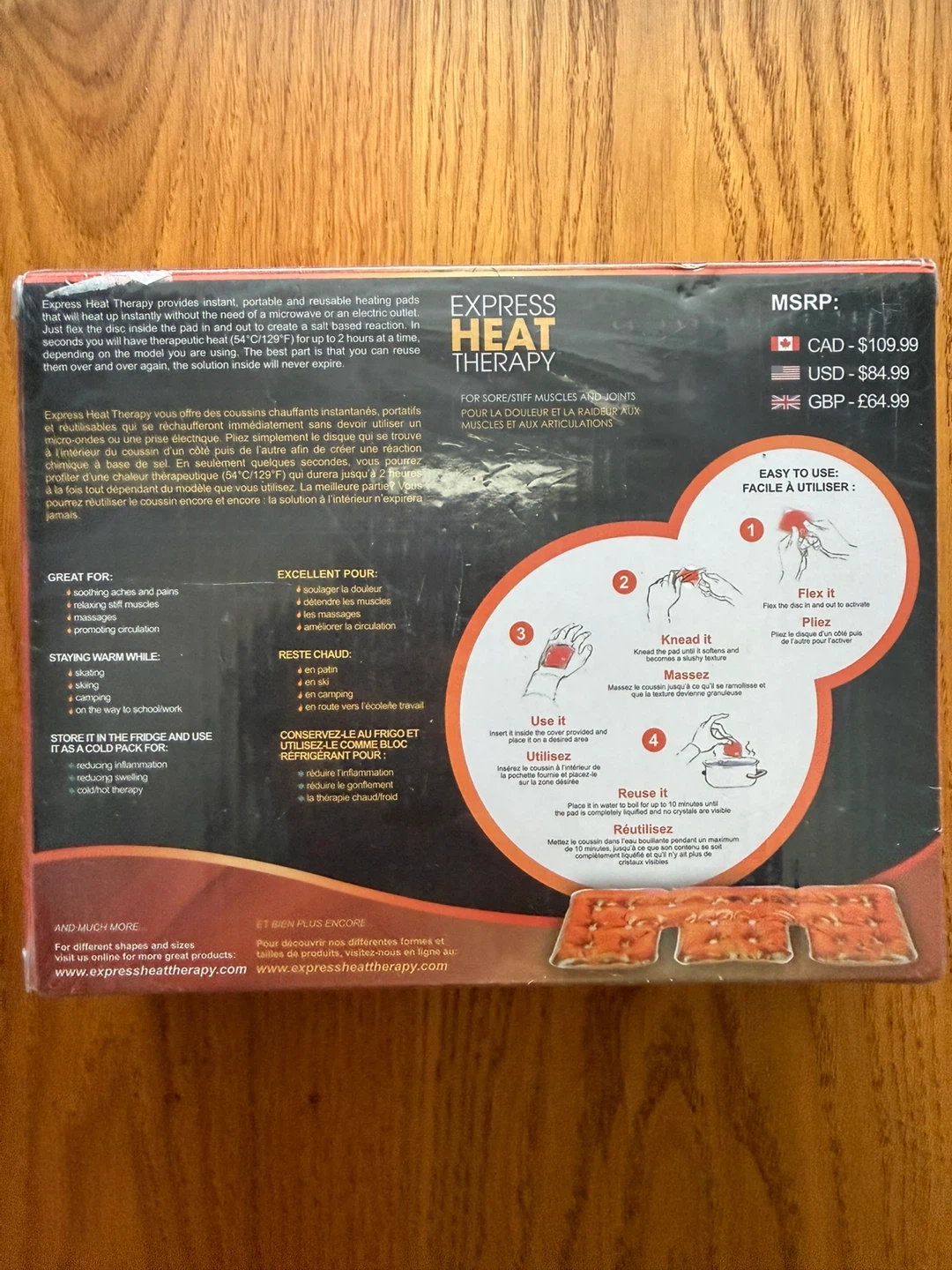 I'm selling Express Heat Therapy reusable instant heat pads! They're great for soothing aches and pains, and for staying warm while camping or commuting. You just flex the disc inside the pad in and out to create a salt based reaction. They're easy to use and reusable! The box is included. Brand new and selling 2 boxes. Both for $100