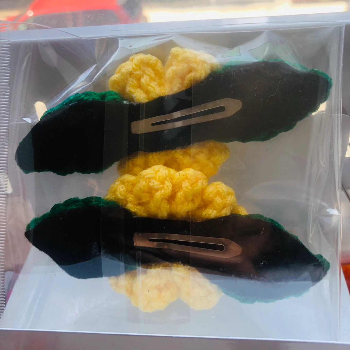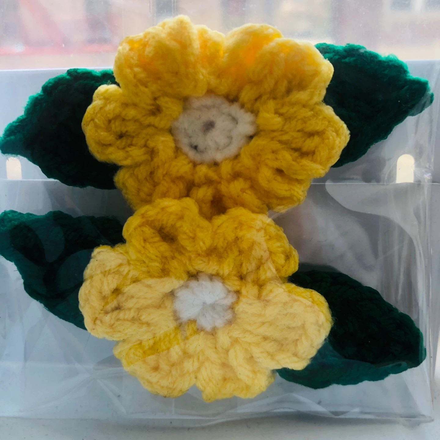 Handmade crocheted flower hair clips featuring yellow flowers with white centers and green leaves. Each clip is designed for a secure hold. These clips add a fun, handmade touch to any hairstyle!