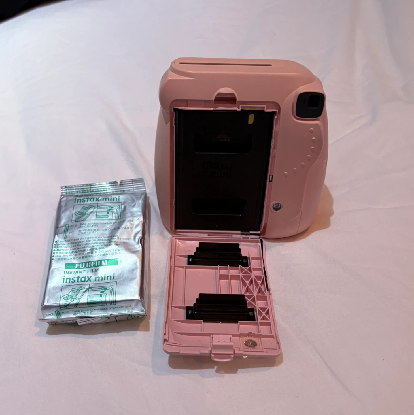 This is a pink Fujifilm Instax Mini 8 instant camera. It comes with a pack of instant film. The camera uses a 60mm lens and features auto exposure mode.