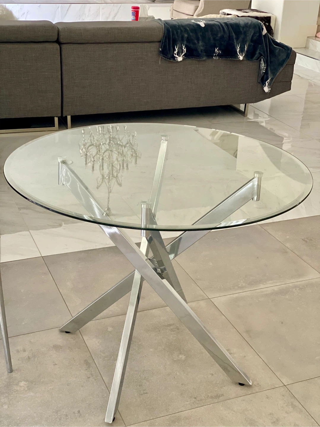 A stylish modern round glass-top dining table featuring a modern chrome criss-cross base. It's perfect for smaller dining spaces / as a breakfast table. This table offers a clear glass surface. No chips.