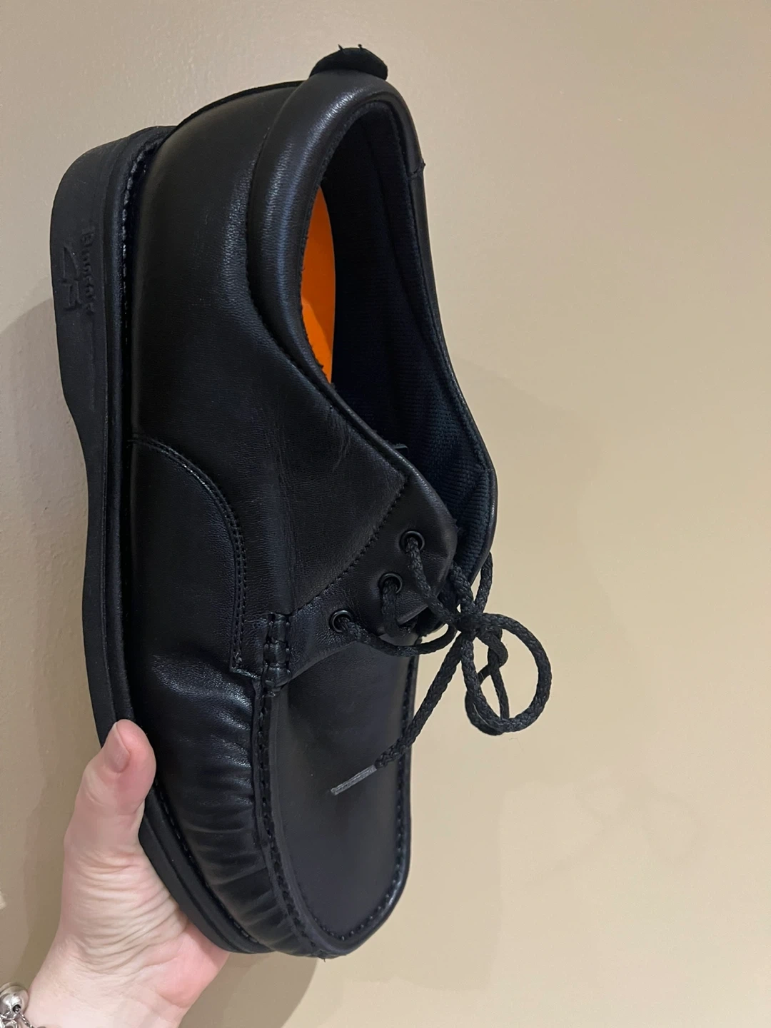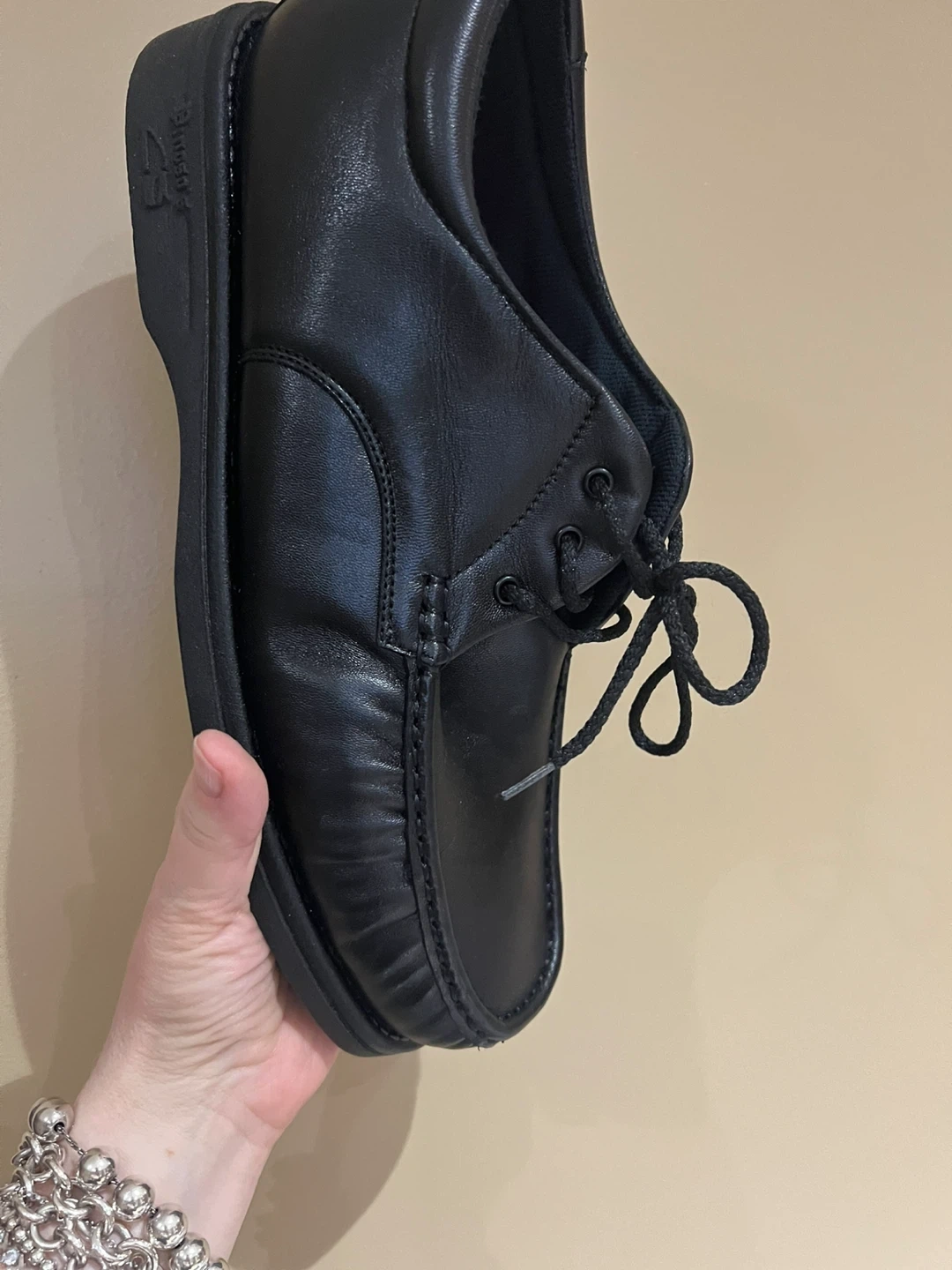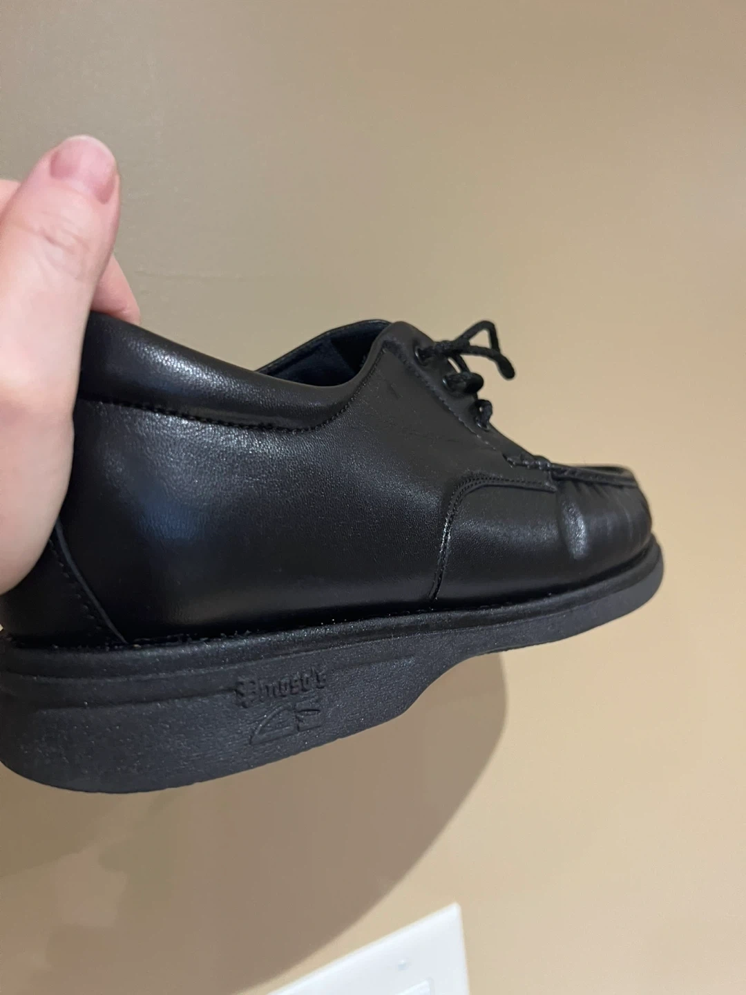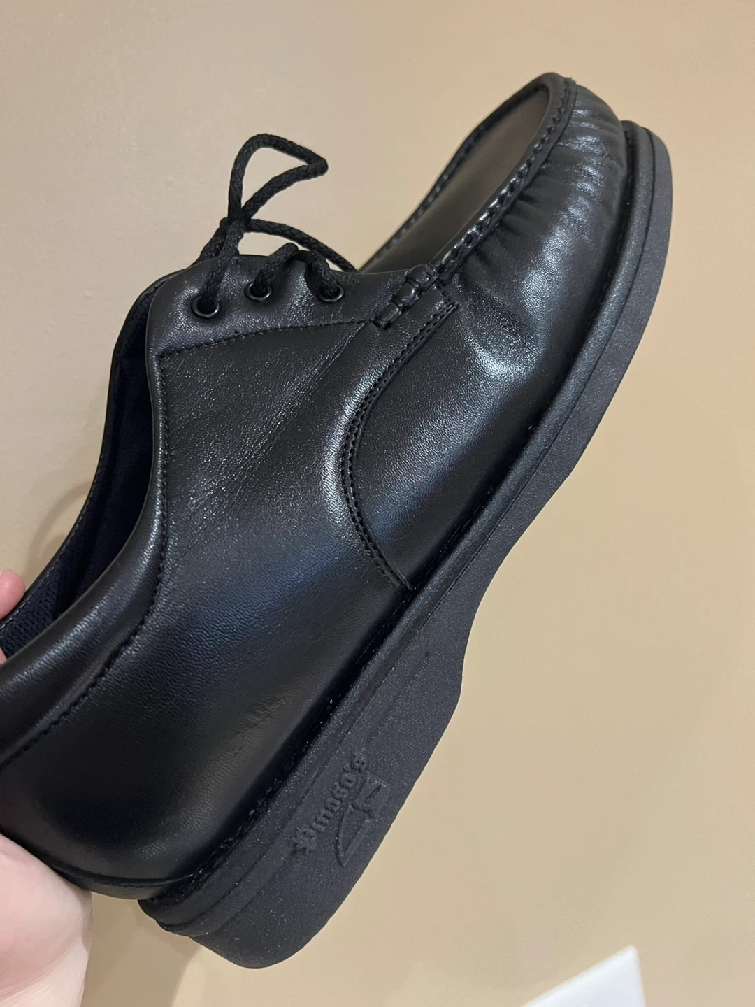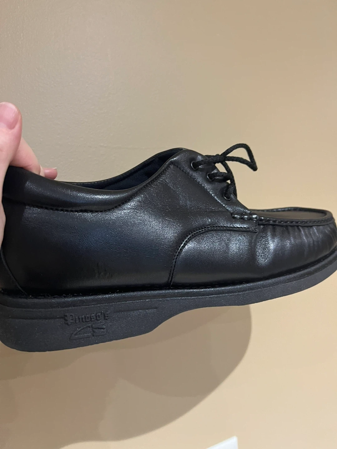 These are black leather lace-up shoes. They feature a classic moc-toe design with a durable sole. Perfect for everyday wear.
