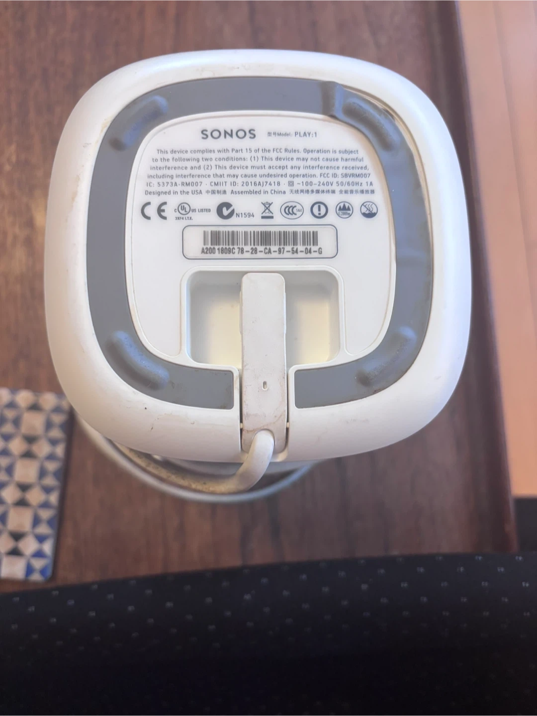 This is a white and grey Sonos speaker. It's in good condition and ready for a new home! Works great for playing music or podcasts.