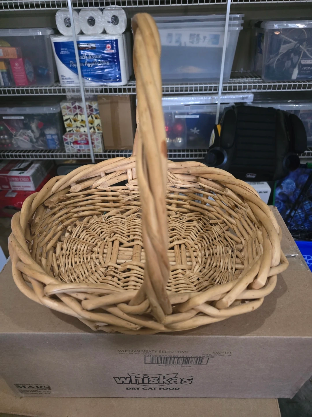 This is a natural wicker basket with a sturdy handle. It's perfect for storage or decorative purposes. Measures approximately 18 inches long, 12 inches wide, and 10 inches tall to the rim.