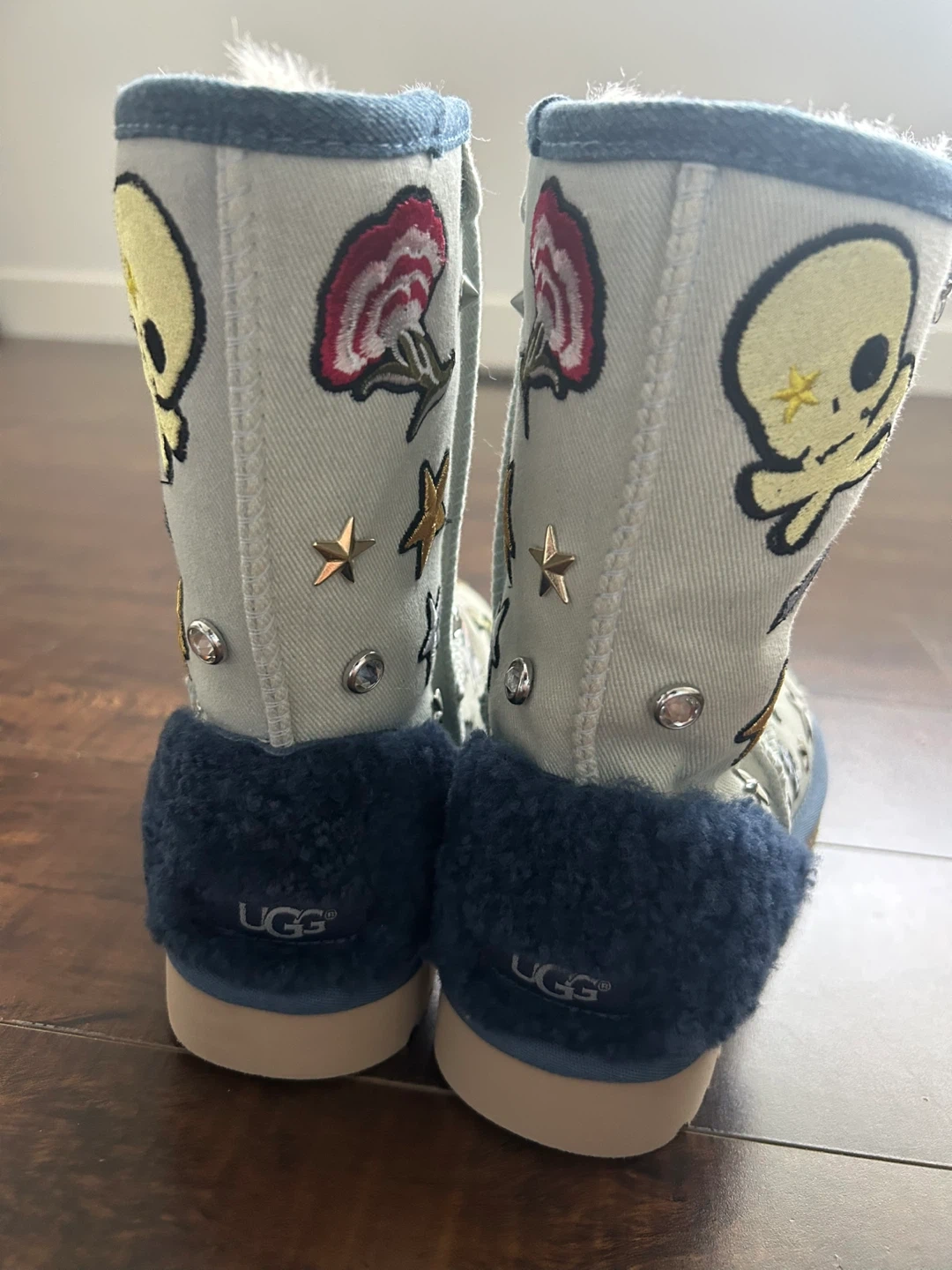 These BRAND NEW UGG boots are a light blue denim-like material and feature various patches like butterflies, skulls, stars, and mushrooms. They have a cozy, fluffy interior lining and a blue faux fur trim around the top. Great for adding some fun to your winter footwear!