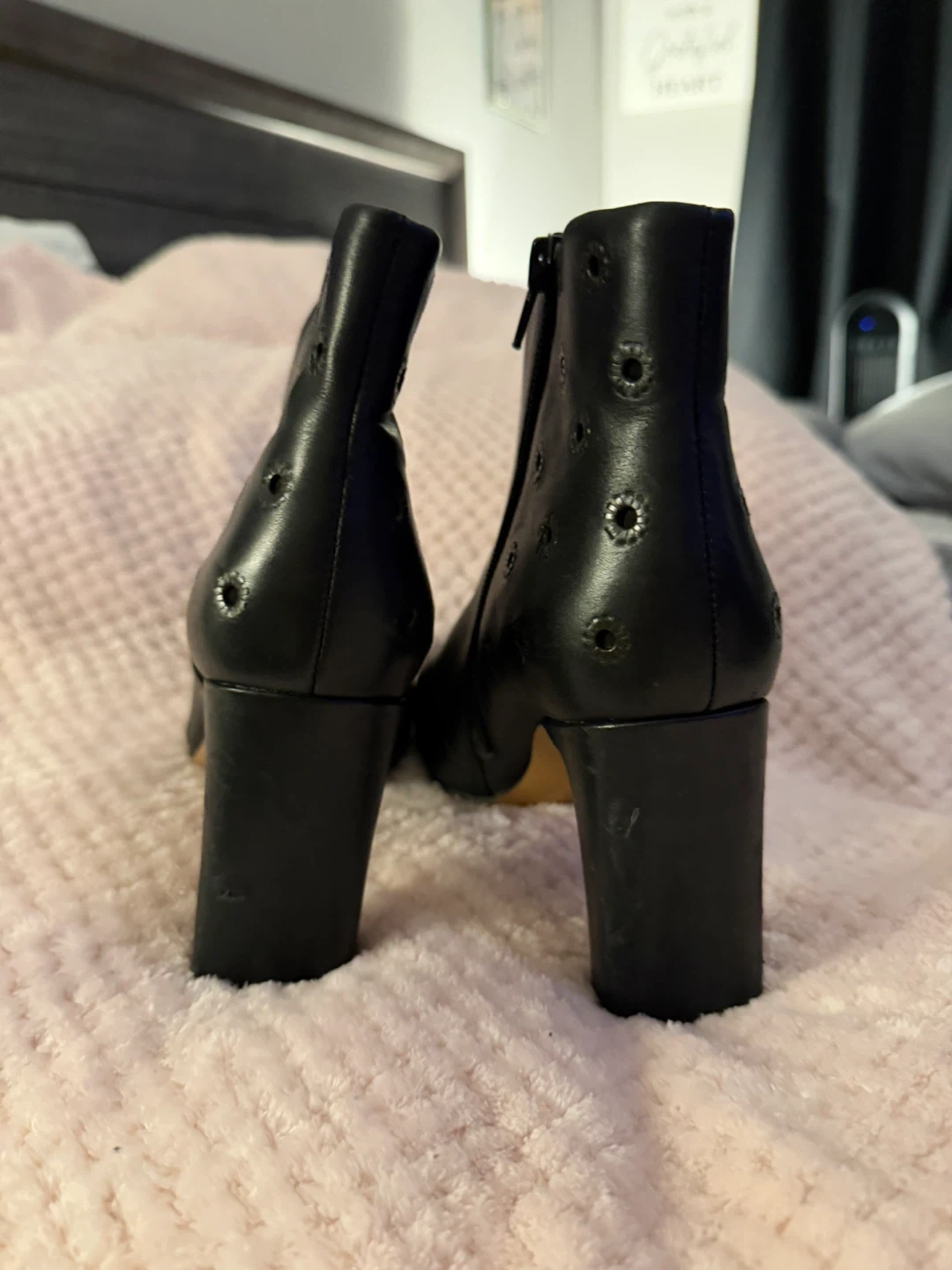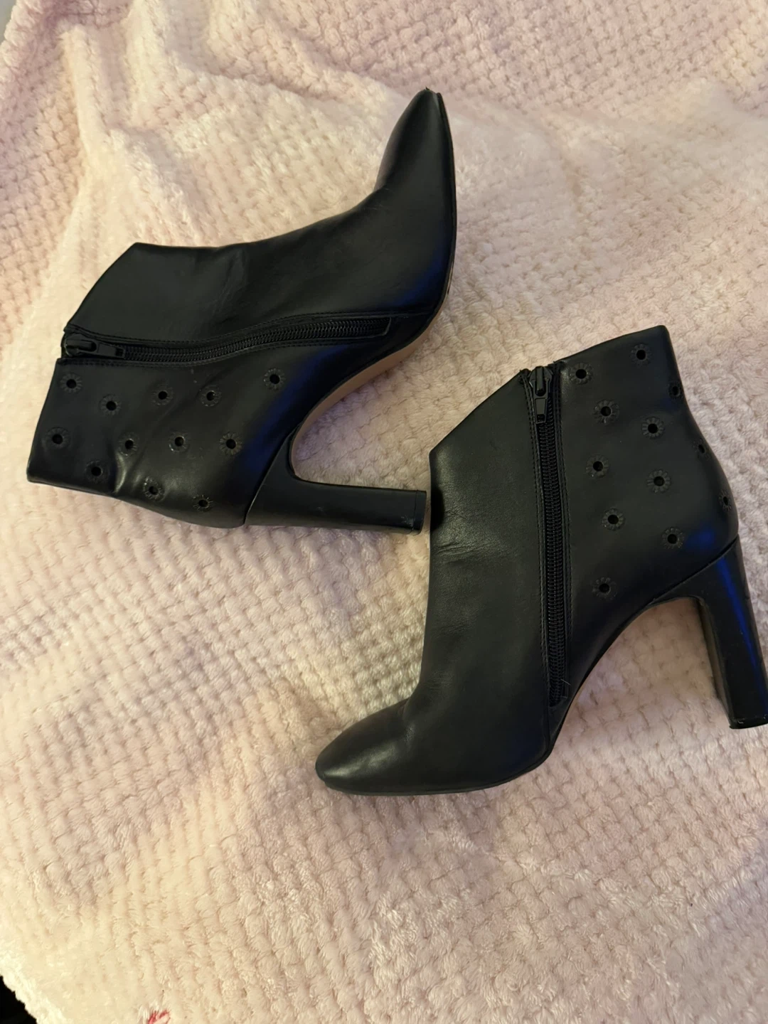 Chic black leather ankle boots featuring a stylish perforated design. These boots have a side zipper closure and a comfortable block heel. Perfect for adding a touch of flair to any outfit!