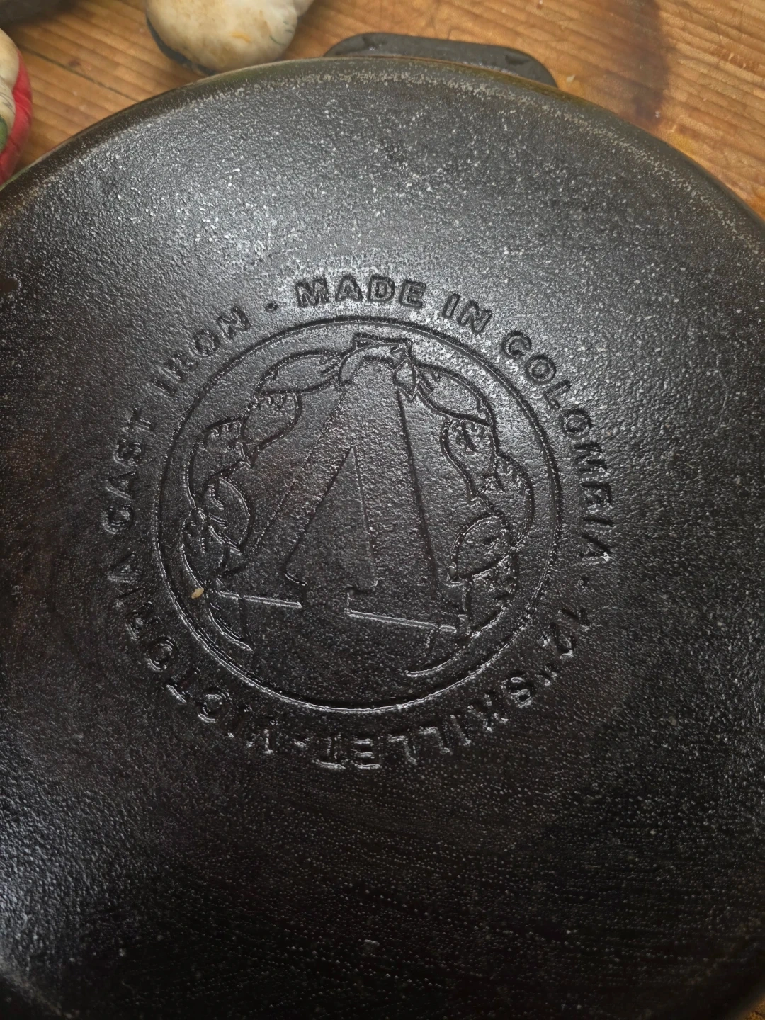 Markings: Your pan features the circular logo with the stylized "V" (often looking like an 'A' within a circle) and text identifying it as "Victoria Cast Iron," "Made in Colombia," and specifying the size, such as "12" Skillet".