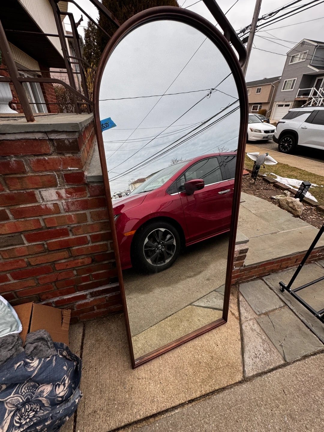 This is a full-length mirror with an arched top. It features a classic wooden frame in a dark stain. The mirror is tall and provides a full reflection.