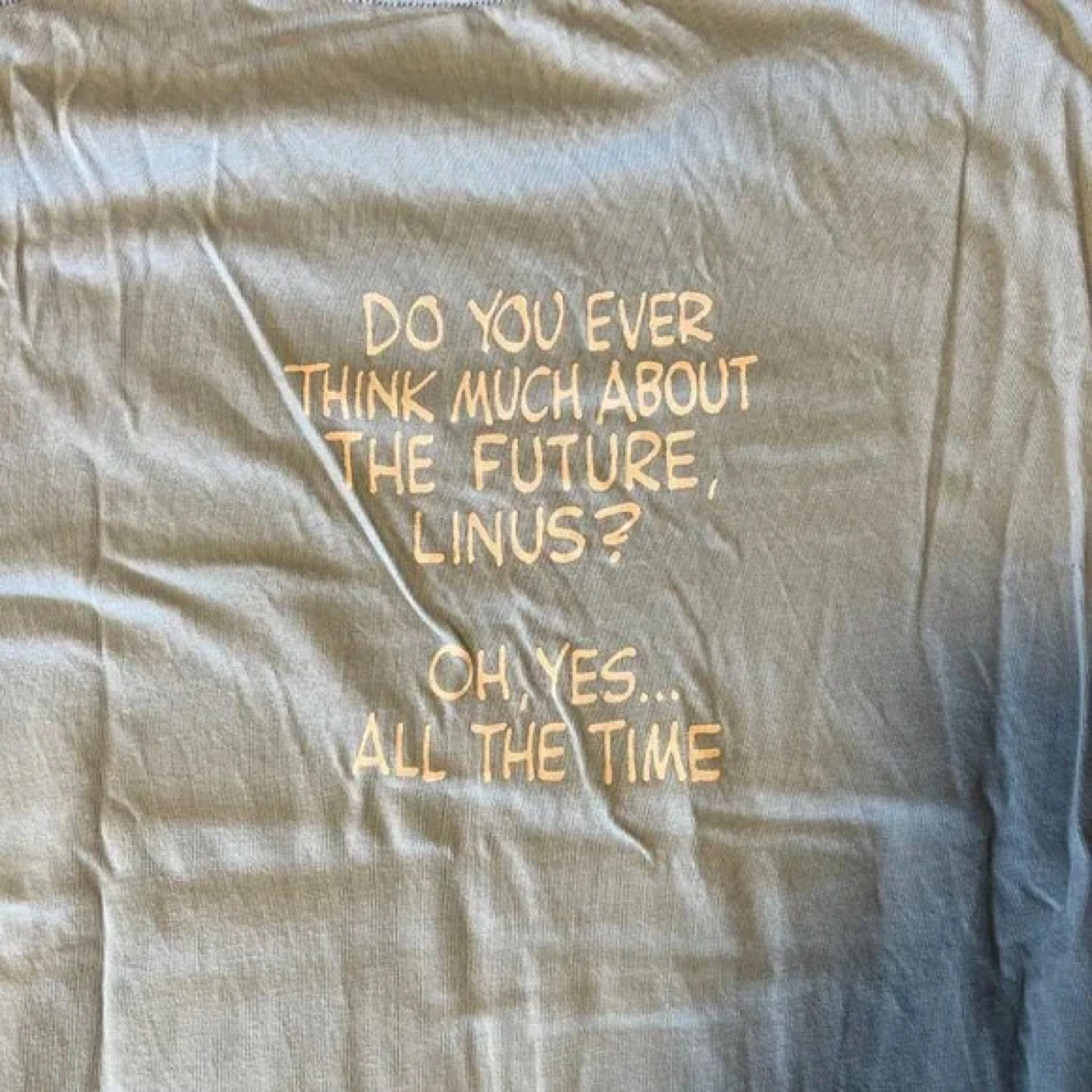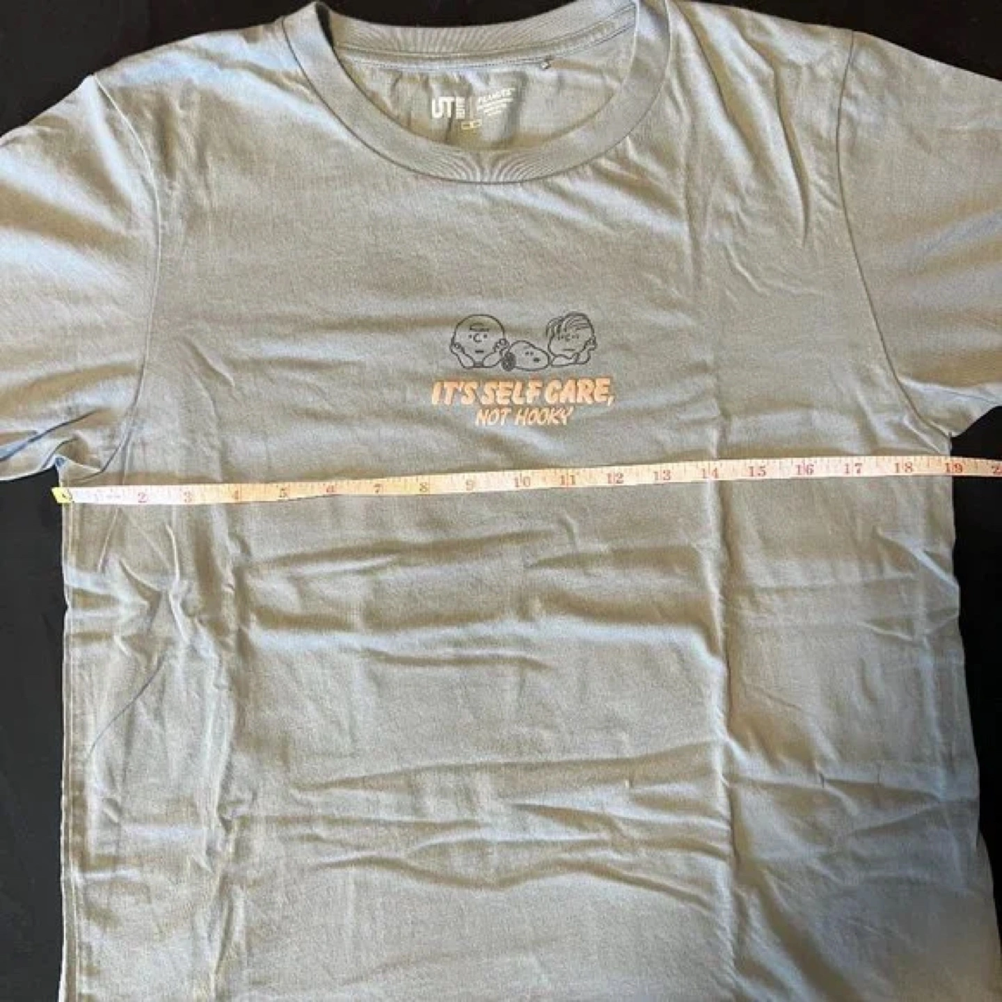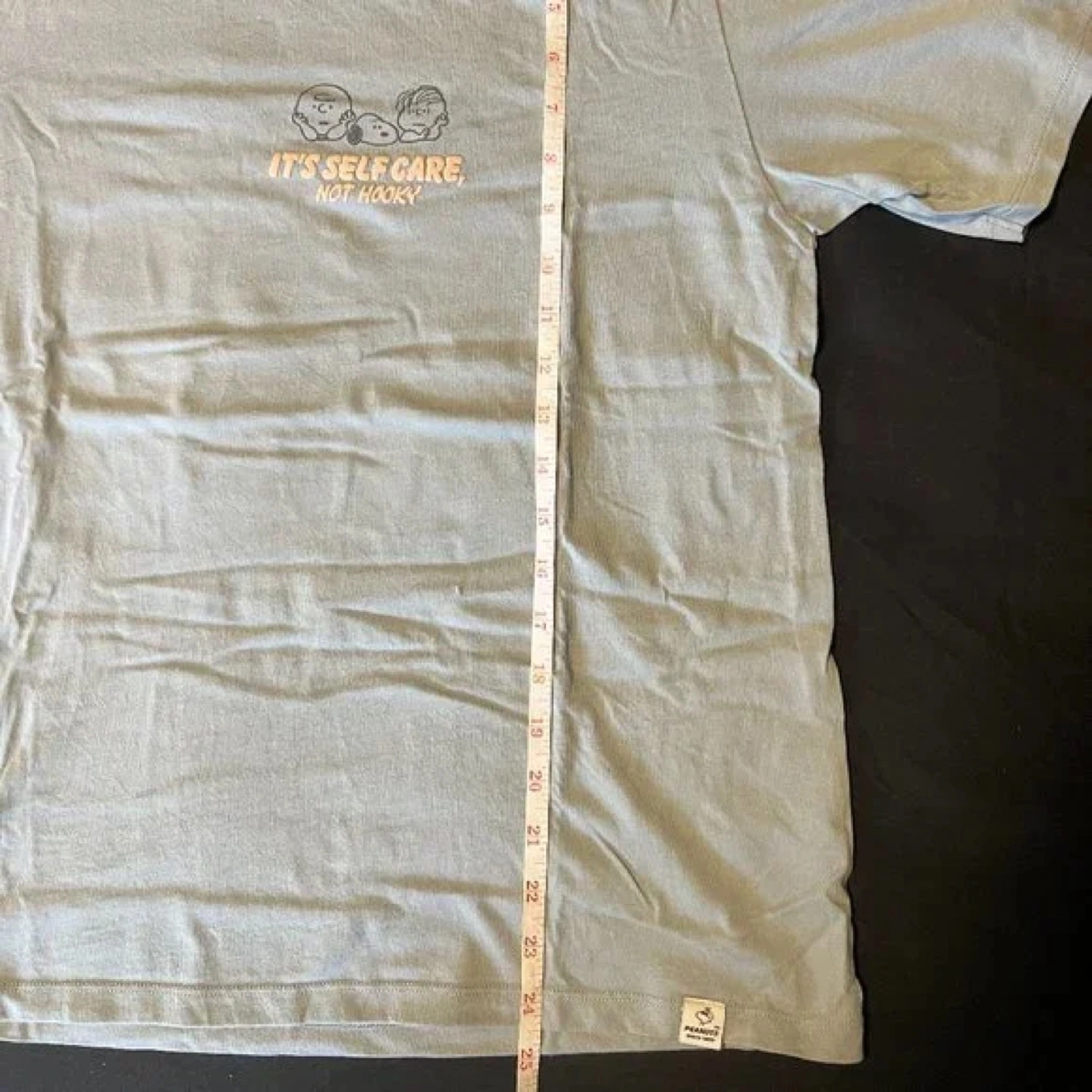 Light blue Peanuts t-shirt. Features Peanuts characters and the text "It's self care, not hooky". Short sleeves. Crew neck.