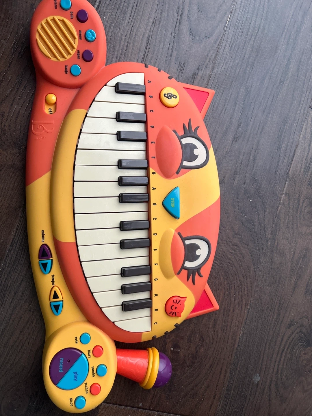 This fun musical toy features a cat-shaped keyboard with colourful keys and a built-in microphone. It has various modes like record and play. Kids can experiment with different sounds and melodies!