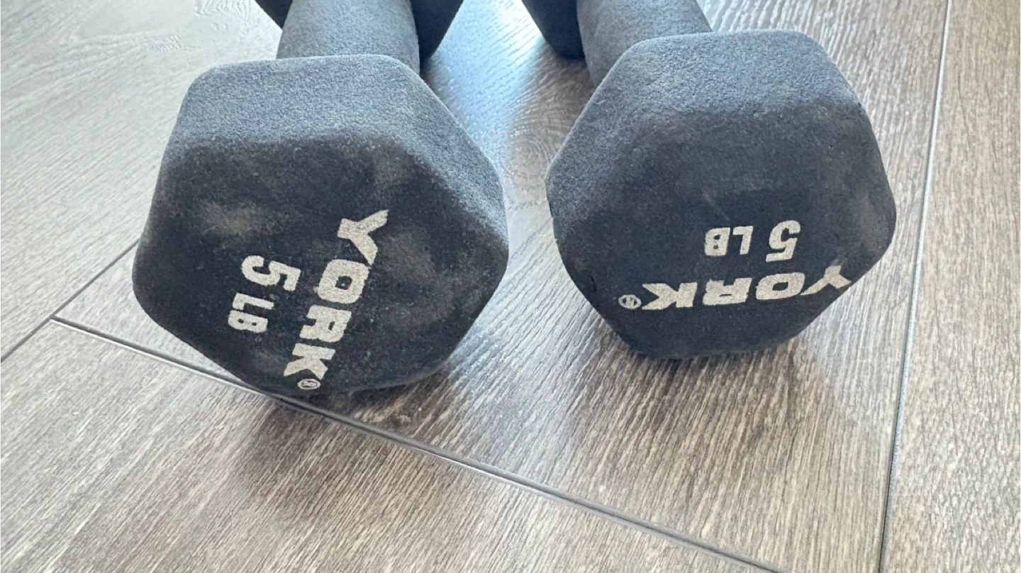 A pair of York 5 lb dumbbells. These weights are coated for a comfortable grip and durability. They're great for various home workouts and strength training.