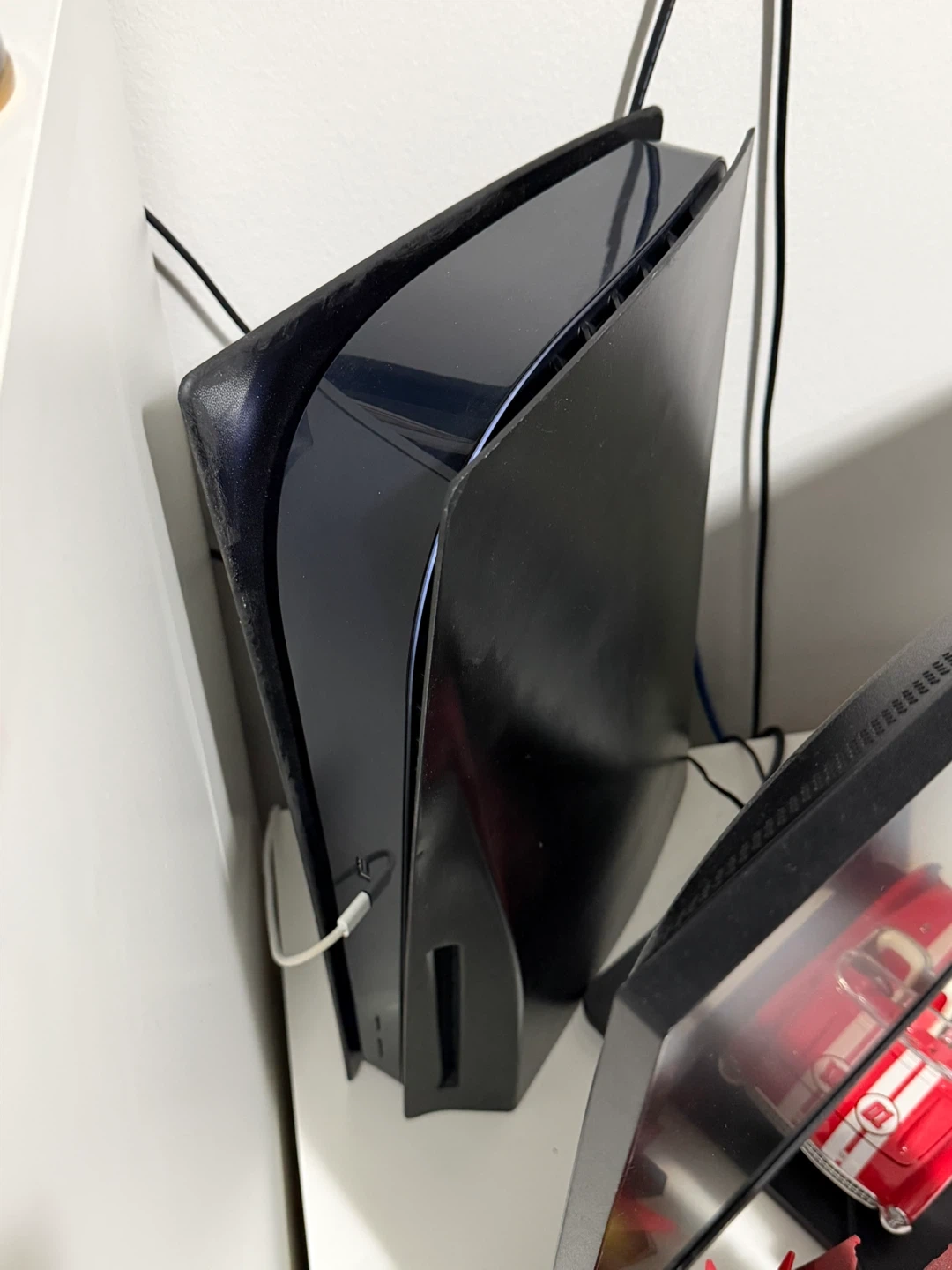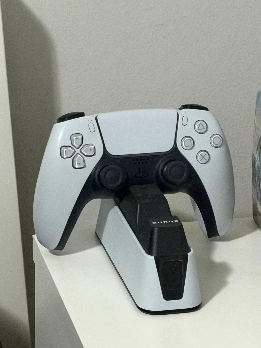 This is a PlayStation 5 console, in black, and includes a Surge brand charging station for your controllers. It's ready for your next gaming adventure! The console's sleek design fits well in any entertainment setup.