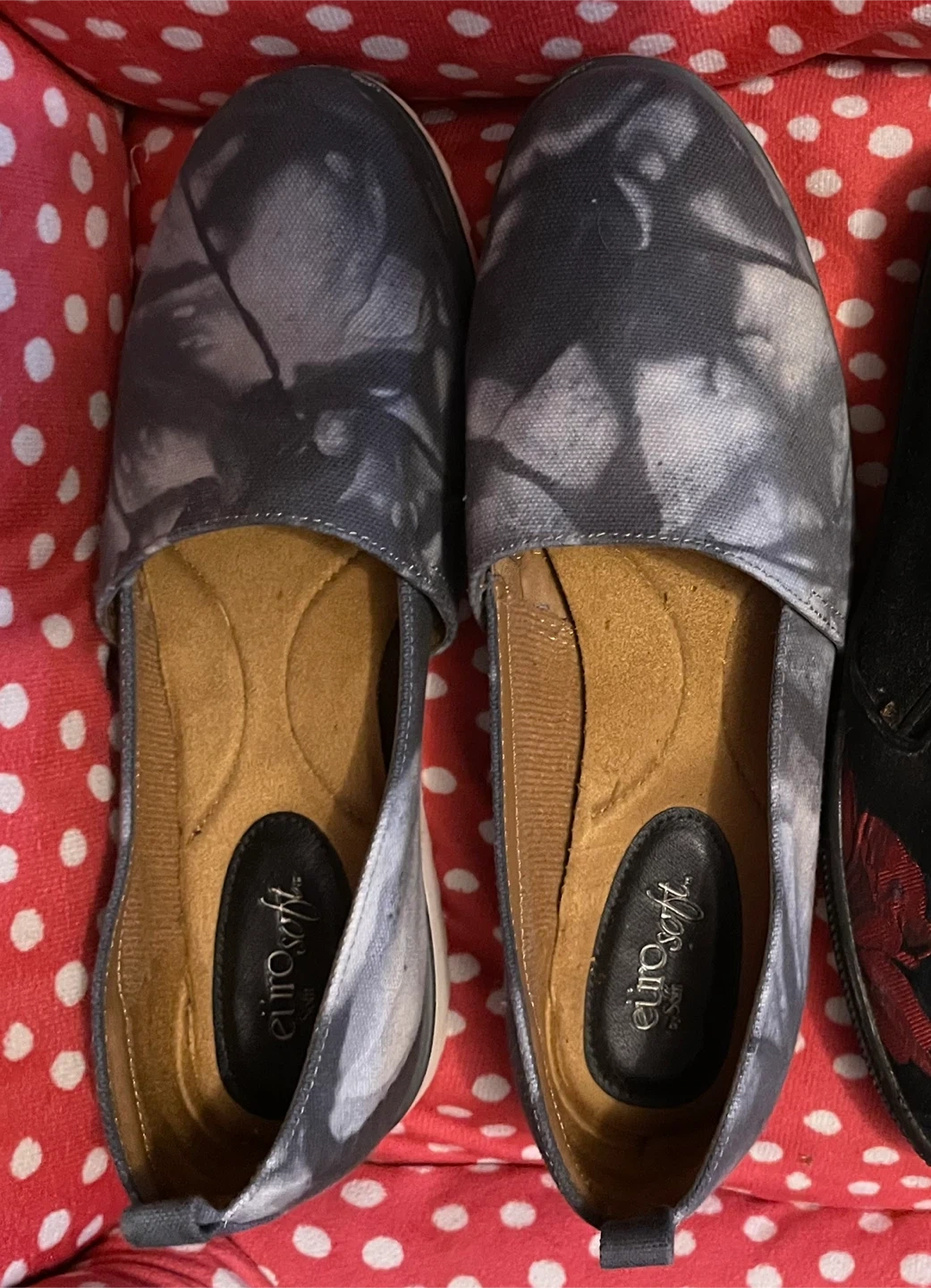 One pair Eurosoft by Sofft grey camouflage fabric slip-on shoes! They're in great condition and ready for a new owner. Perfect for a casual day out or just lounging around at home. Reinforced padded interior.