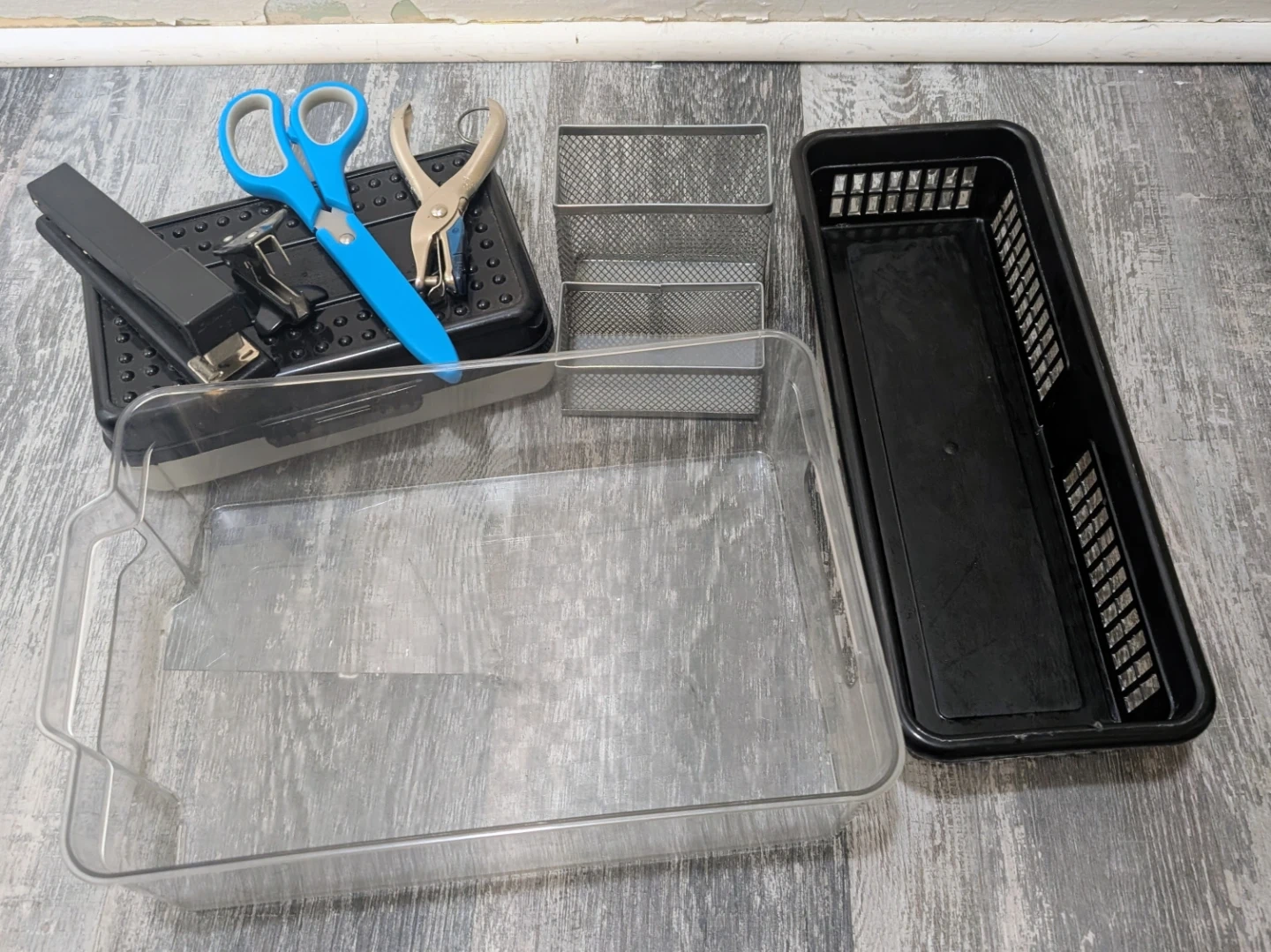 Useful bundle of desk organizers and office supplies. Has a clear plastic bin and a black plastic bin. Comes with metal mesh organizers and clear pencil case with black lid. Also includes a black stapler, blue scissors, a staple remover, and a small hole punch. Good for tidying up your desk or craft area. All for $5.