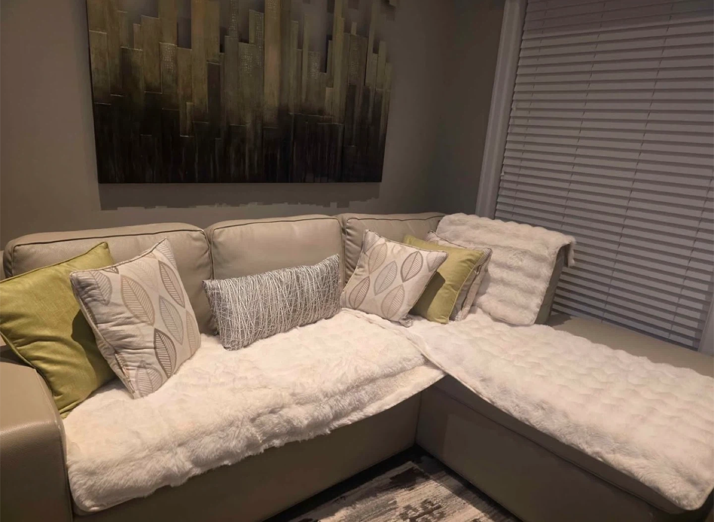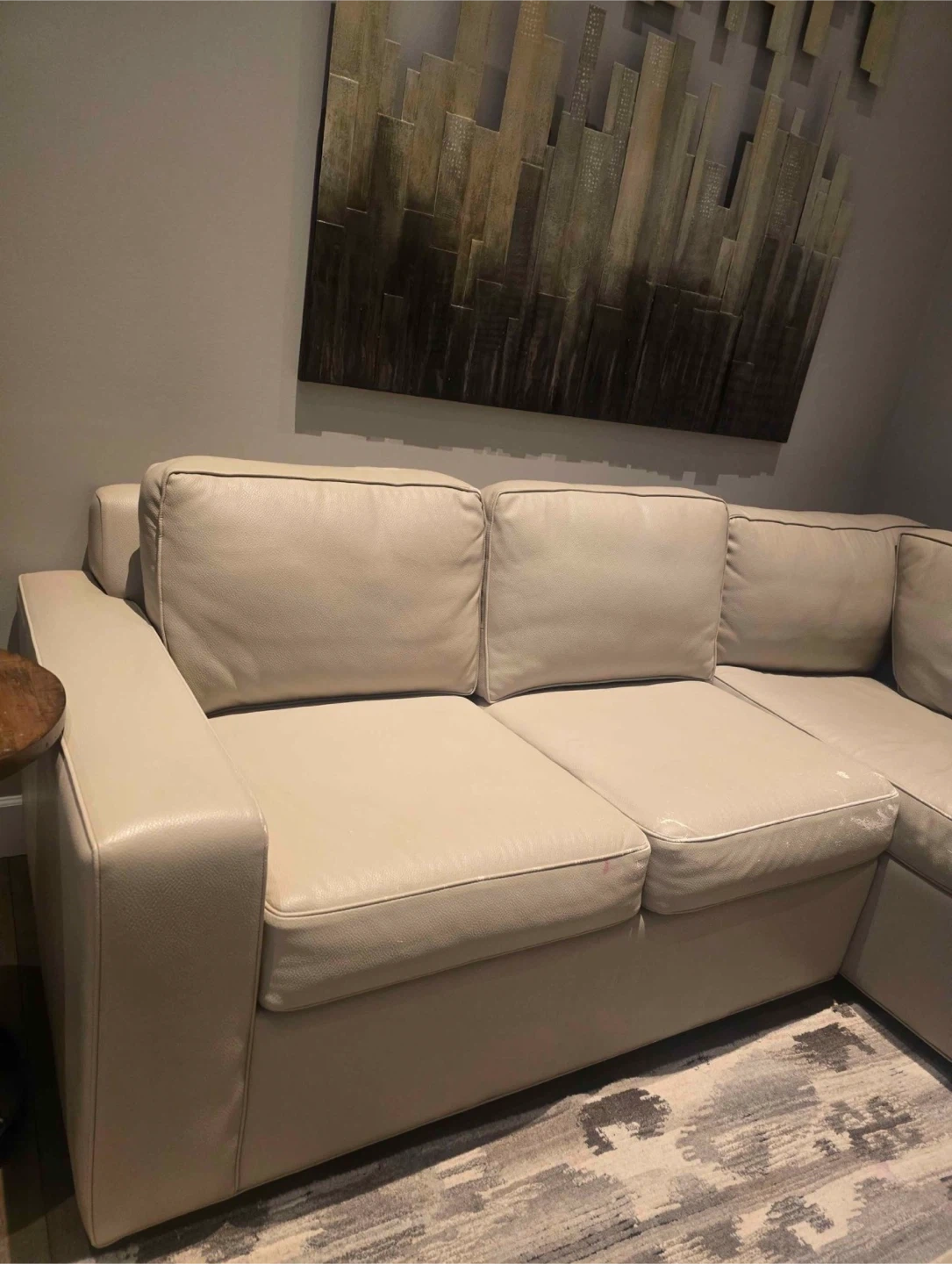 • L-shaped sectional• Comfortable cushions• Neutral beige color (matches any decor)• Smoke-free and pet free home