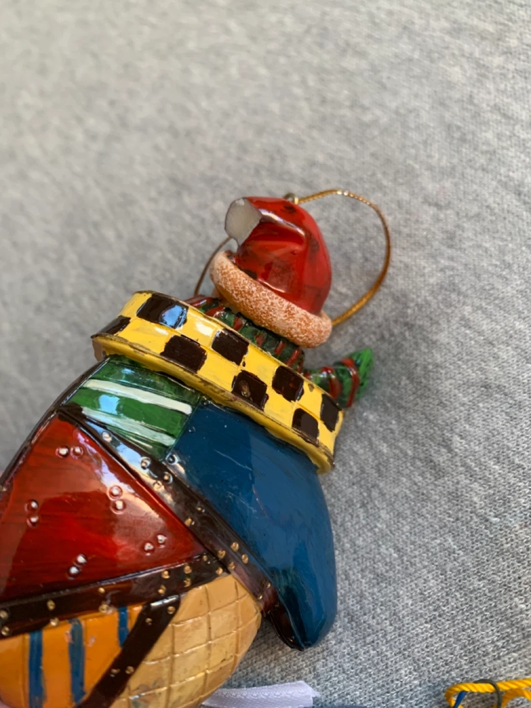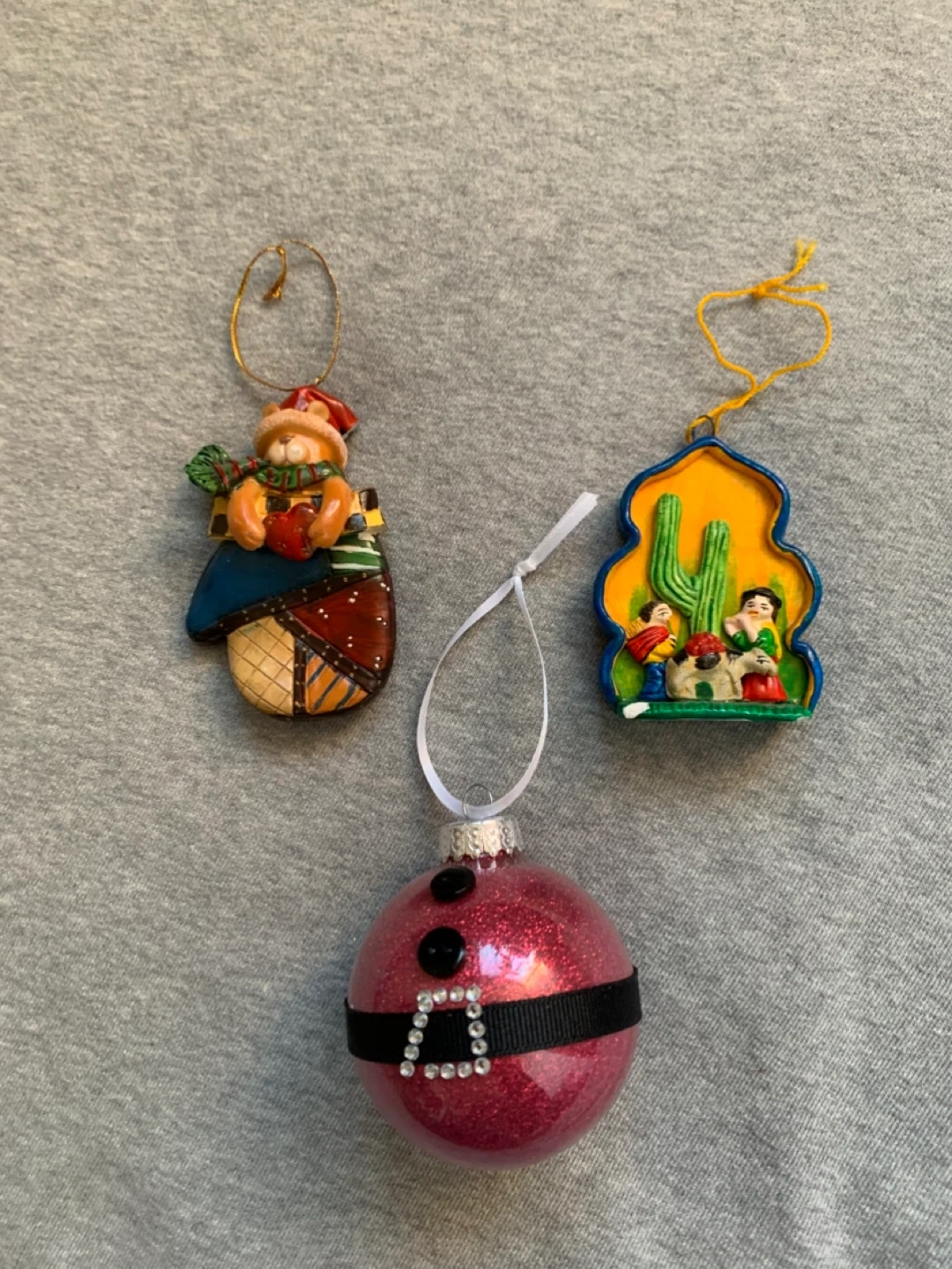 One is a sparkly red ball with a black ribbon and buckle detail meant to depict a Santa Claus suit. Another is a bear in a mitten, the tip of his hat has snapped and broken off. The third depicts a Nativity scene with the Holy Family that needs a bit of green touch up paint where it’s chipped.