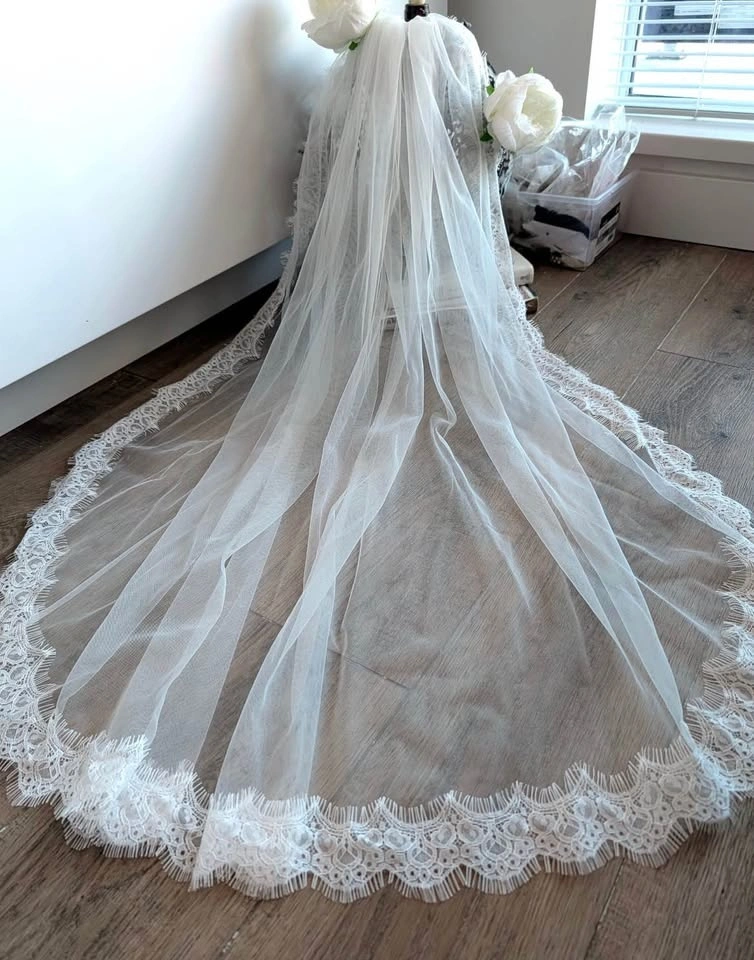 Lace Trim Fingertip Veil - Soft White or Ivory