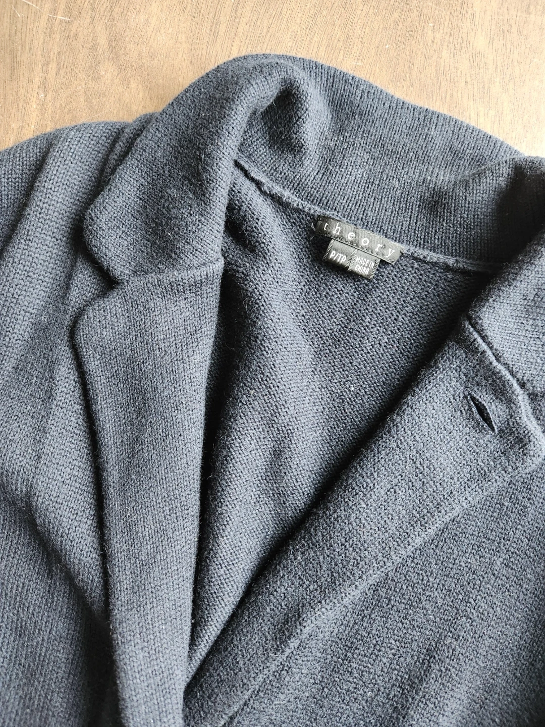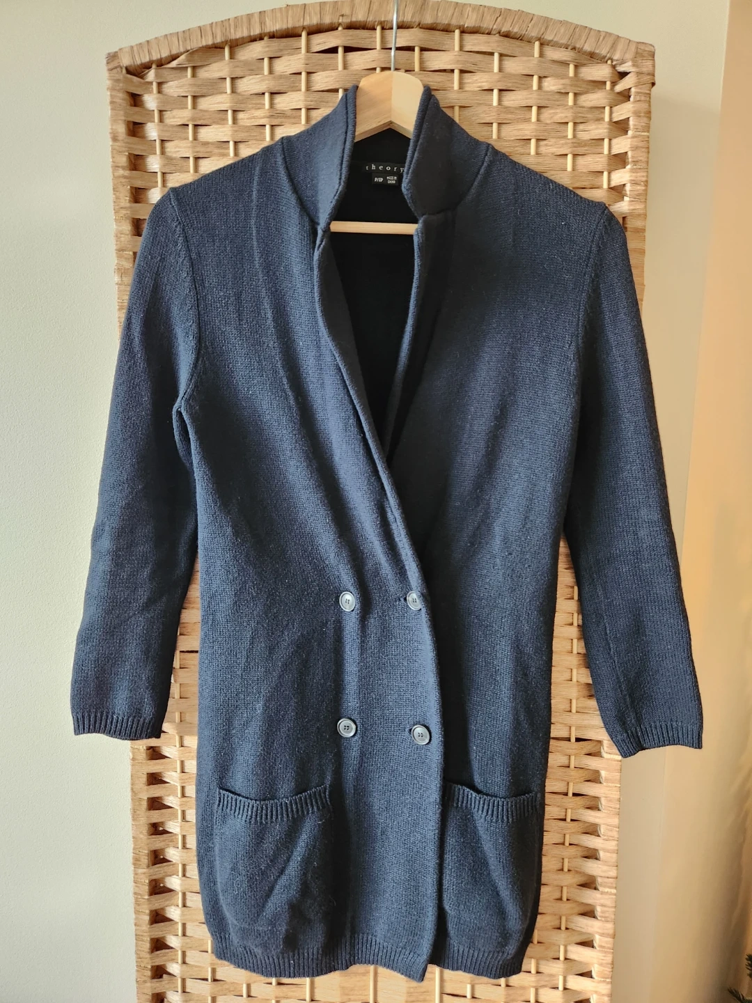 Selling a Theory knit blazer-shaped mid length cardigan in a dark navy colour. It's a size P/TP (petite Small). It's in great condition and perfect for layering or wearing on its own!