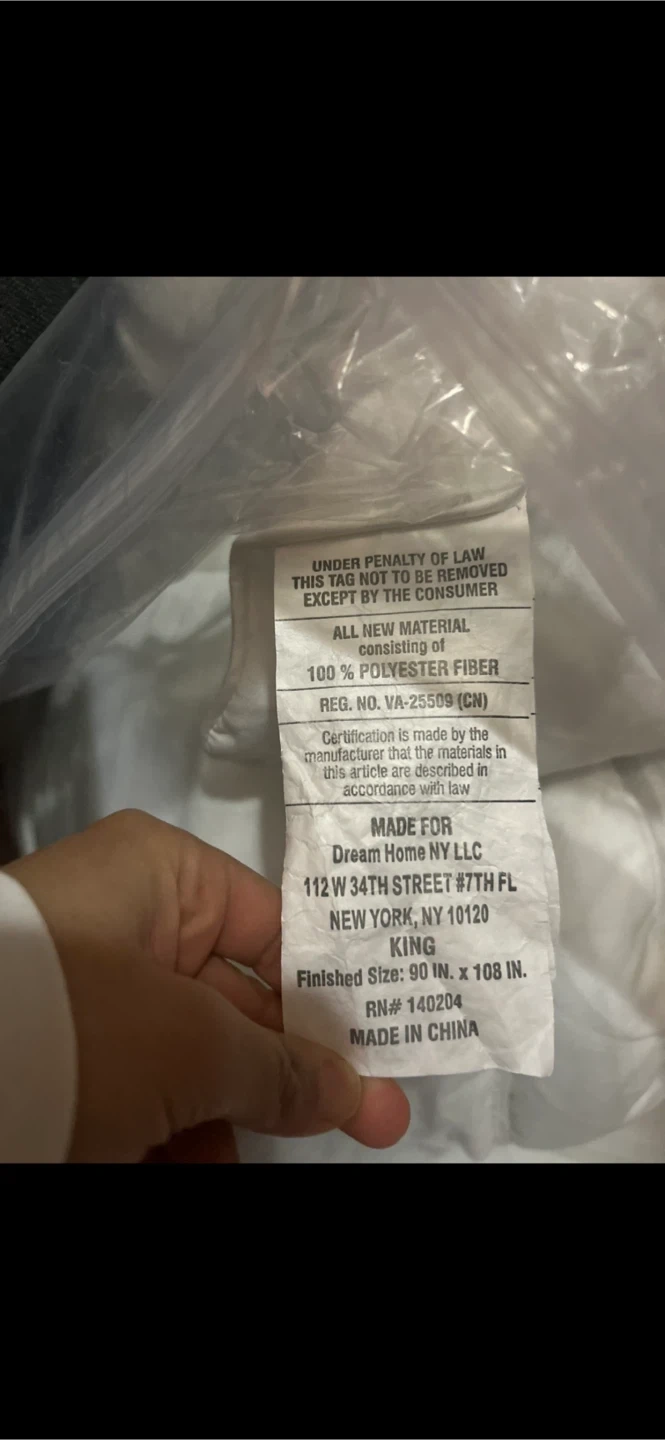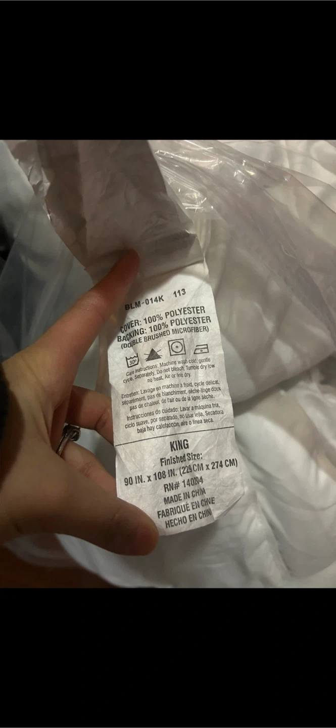 This is a king-size comforter or duvet, finished size 90 in. x 108 in. It's made from 100% polyester fiber, with a double brushed microfiber cover and backing. Machine washable.