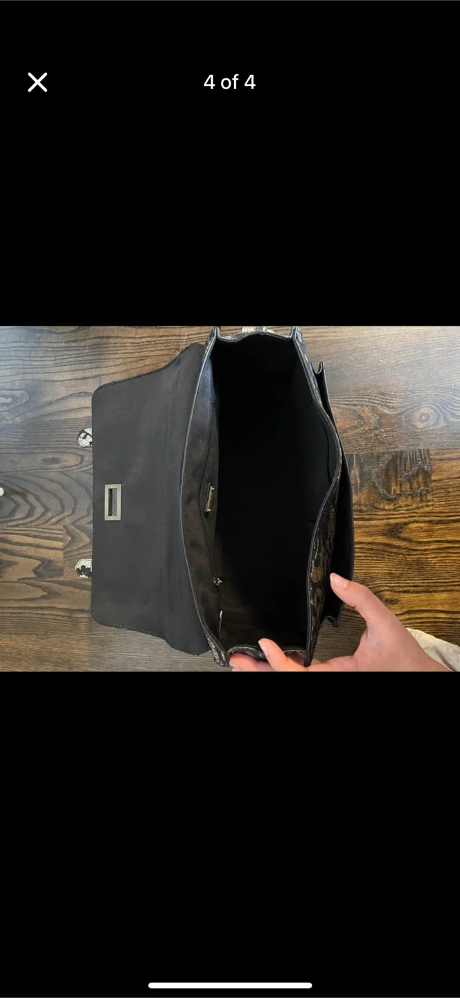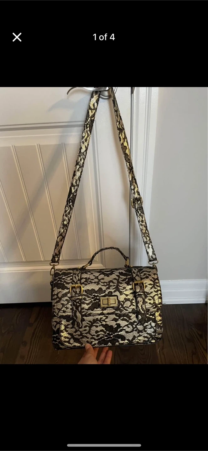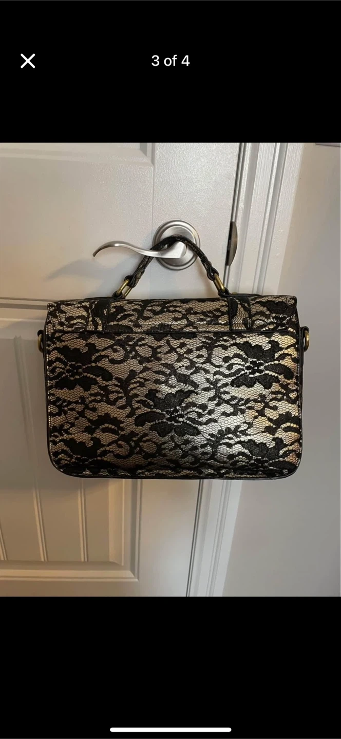 This purse features a beautiful black and gold lace design. It has a structured shape and a detachable shoulder strap. Perfect for adding a touch of glam to any outfit!